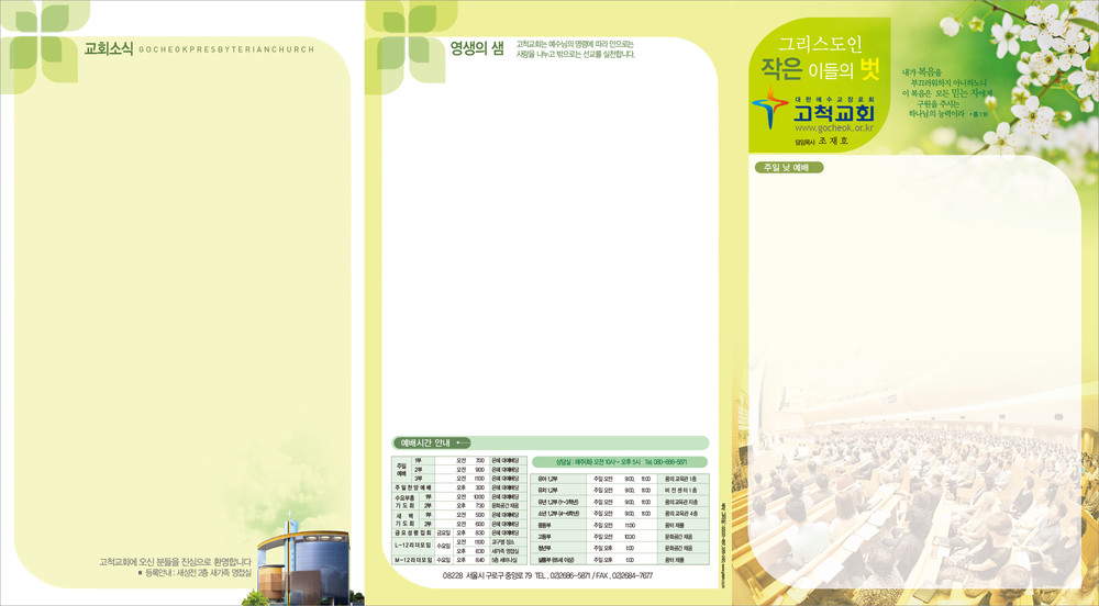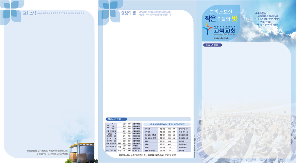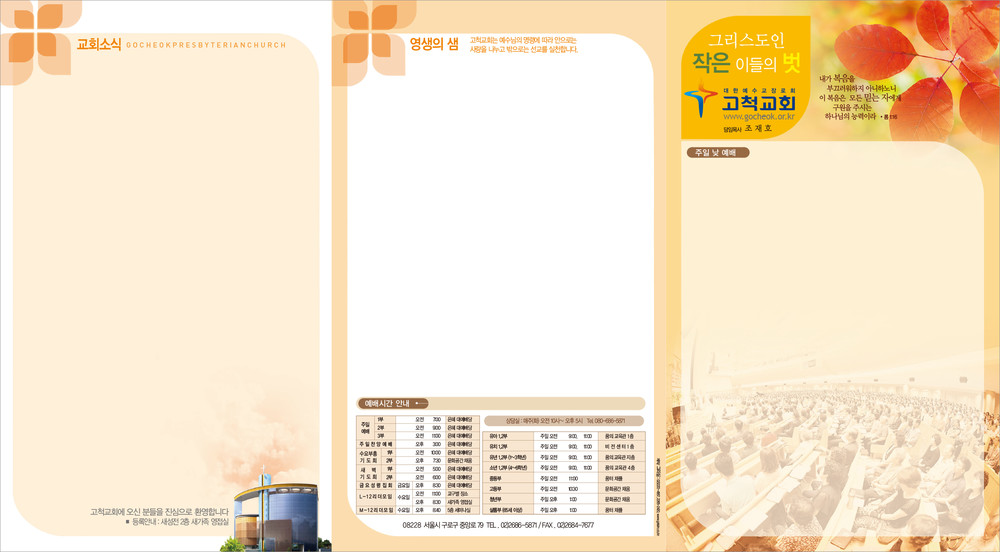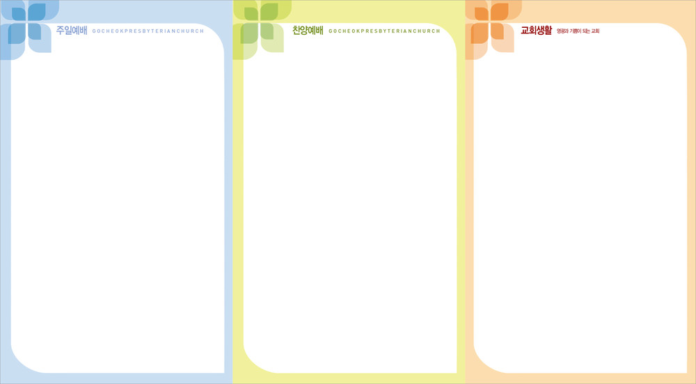 모든 디자인이 완료된 후 현재 교회가 사용중인 한글파일을 보내주시면, 새로운 주보에 맞추어 인쇄가 가능하도록 한글파일을 제작해드리고 있습니다. (한글작업 요청시 약 1-3일 정도의 시간이 소요되오니 참고해 주시기 바랍니다.)