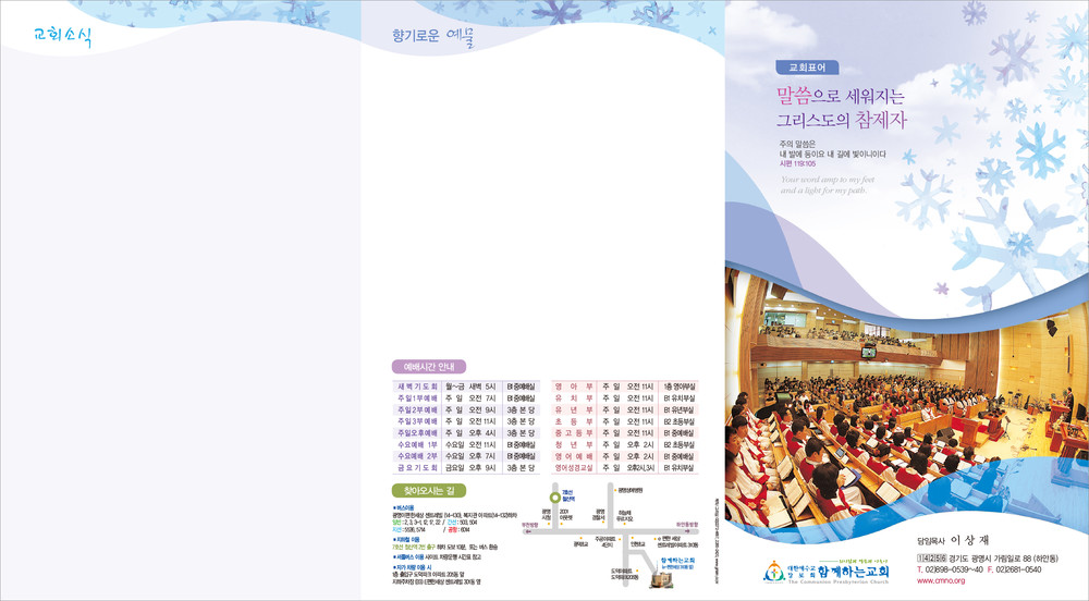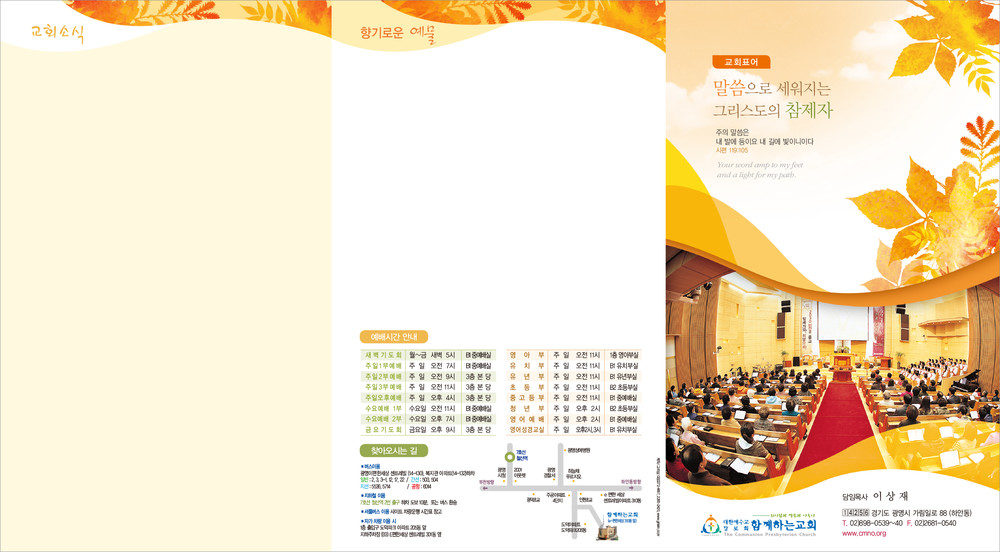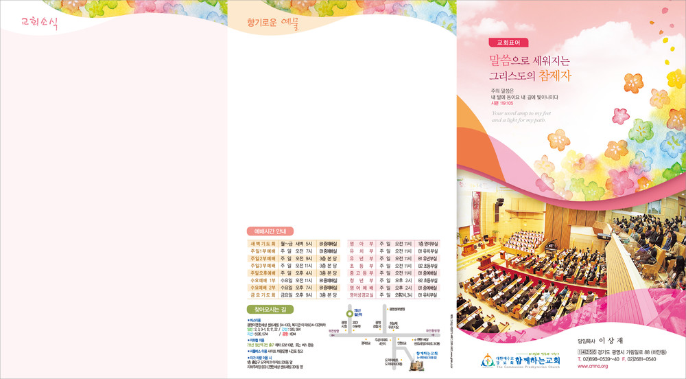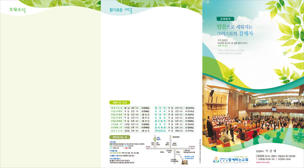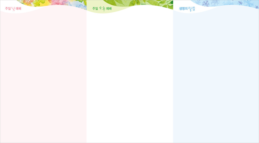 모든 디자인이 완료된 후 현재 교회가 사용중인 한글파일을 보내주시면, 새로운 주보에 맞추어 인쇄가 가능하도록 한글파일을 제작해드리고 있습니다. (한글작업 요청시 약 1-3일 정도의 시간이 소요되오니 참고해 주시기 바랍니다.)