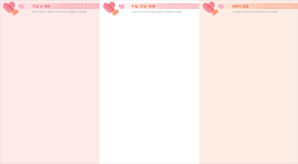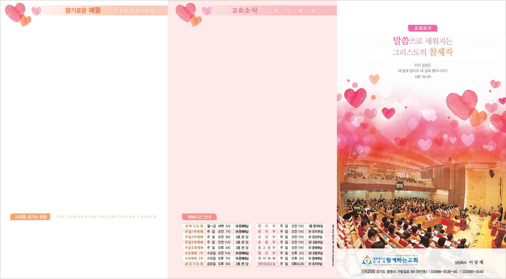 모든 디자인이 완료된 후 현재 교회가 사용중인 한글파일을 보내주시면, 새로운 주보에 맞추어 인쇄가 가능하도록 한글파일을 제작해드리고 있습니다. (한글작업 요청시 약 1-3일 정도의 시간이 소요되오니 참고해 주시기 바랍니다.)
