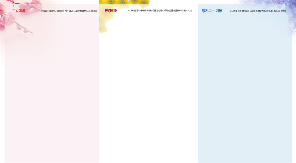 모든 디자인이 완료된 후 현재 교회가 사용중인 한글파일을 보내주시면, 새로운 주보에 맞추어 인쇄가 가능하도록 한글파일을 제작해드리고 있습니다. (한글작업 요청시 약 1-3일 정도의 시간이 소요되오니 참고해 주시기 바랍니다.)
