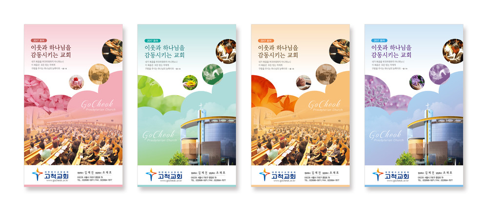 보통 교정을 컴퓨터 모니터나, 칼라 프린터로 출력해서 보시는 경우 모니터(빛의 색 RGB)와 인쇄물(잉크색 CMYK)에는 약간의 차이가 있습니다. 각 교회에서 사용되는 칼라 프린트도 옵셋 인쇄와는 인쇄 방식이 조금 달라 색상의 차이가 있습니다. 특히 종이의 재질(모조지, 아트지, 고급용지)에 의한 색의 차이도 발생할 수 있습니다.