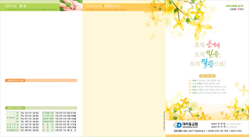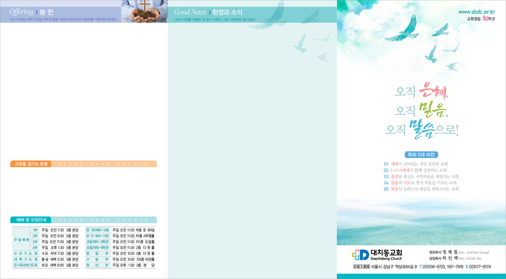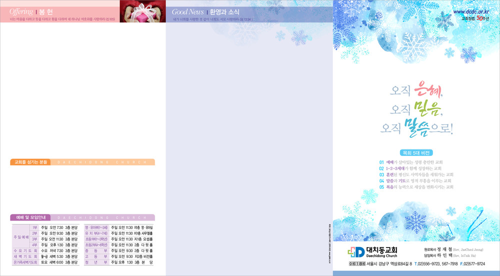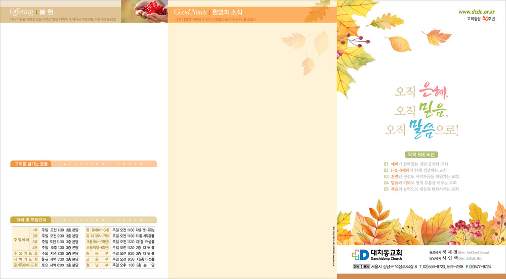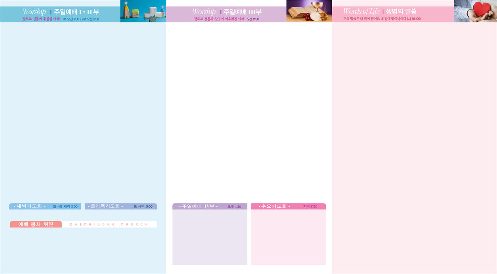 모든 디자인이 완료된 후 현재 교회가 사용중인 한글파일을 보내주시면, 새로운 주보에 맞추어 인쇄가 가능하도록 한글파일을 제작해드리고 있습니다. (한글작업 요청시 약 1-3일 정도의 시간이 소요되오니 참고해 주시기 바랍니다.)