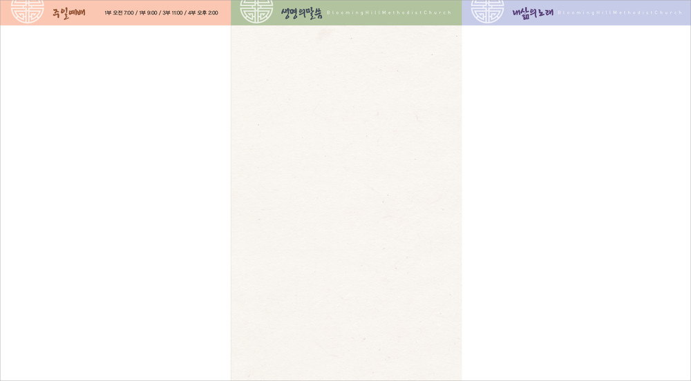 모든 디자인이 완료된 후 현재 교회가 사용중인 한글파일을 보내주시면, 새로운 주보에 맞추어 인쇄가 가능하도록 한글파일을 제작해드리고 있습니다. (한글작업 요청시 약 1-3일 정도의 시간이 소요되오니 참고해 주시기 바랍니다.)