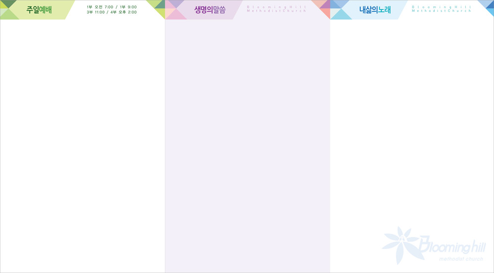 모든 디자인이 완료된 후 현재 교회가 사용중인 한글파일을 보내주시면, 새로운 주보에 맞추어 인쇄가 가능하도록 한글파일을 제작해드리고 있습니다. (한글작업 요청시 약 1-3일 정도의 시간이 소요되오니 참고해 주시기 바랍니다.)