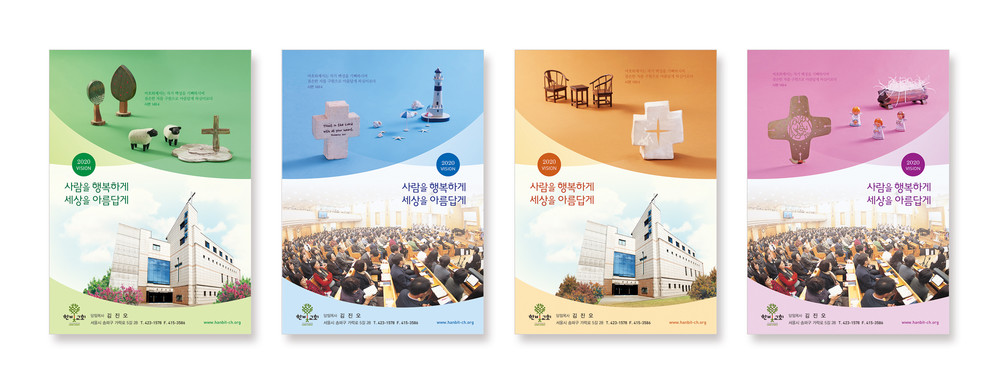보통 교정을 컴퓨터 모니터나, 칼라 프린터로 출력해서 보시는 경우 모니터(빛의 색 RGB)와 인쇄물(잉크색 CMYK)에는 약간의 차이가 있습니다. 각 교회에서 사용되는 칼라 프린트도 옵셋 인쇄와는 인쇄 방식이 조금 달라 색상의 차이가 있습니다. 특히 종이의 재질(모조지, 아트지, 고급용지)에 의한 색의 차이도 발생할 수 있습니다.