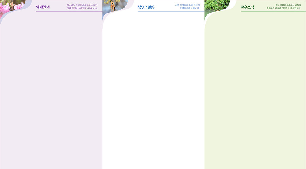 모든 디자인이 완료된 후 현재 교회가 사용중인 한글파일을 보내주시면, 새로운 주보에 맞추어 인쇄가 가능하도록 한글파일을 제작해드리고 있습니다. (한글작업 요청시 약 1-3일 정도의 시간이 소요되오니 참고해 주시기 바랍니다.)