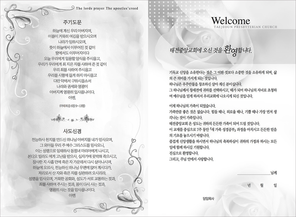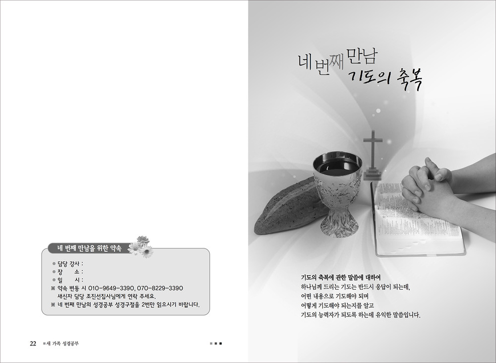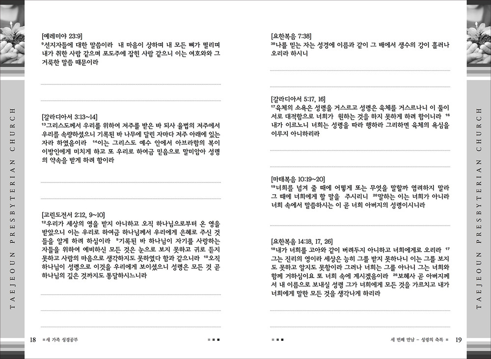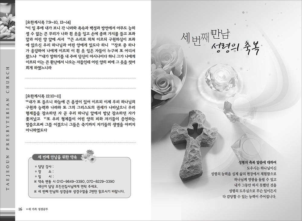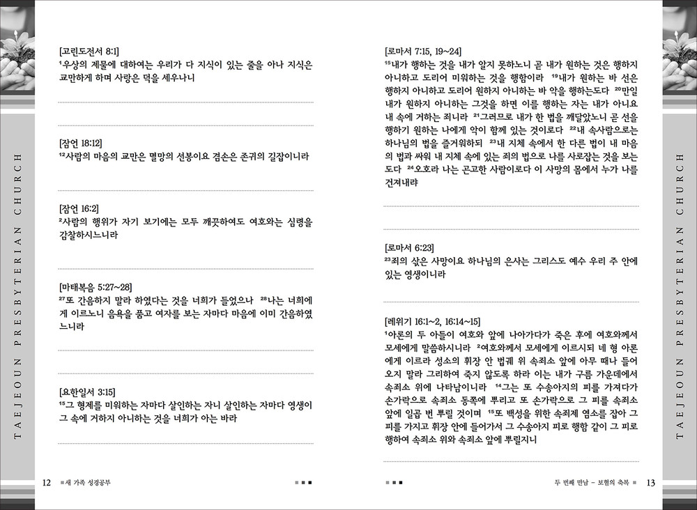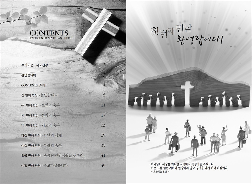 교회는 아주 다양한 행사와 교육이 이루어집니다. 추추감사절과 사순절에 이루어지는 새벽집회 묵상집, 새신자들을 위한 새신자 교재, 은혜에 감사하여 간증한 내용의 간증전도집 등 작고 간결한 디자인의 책자입니다.