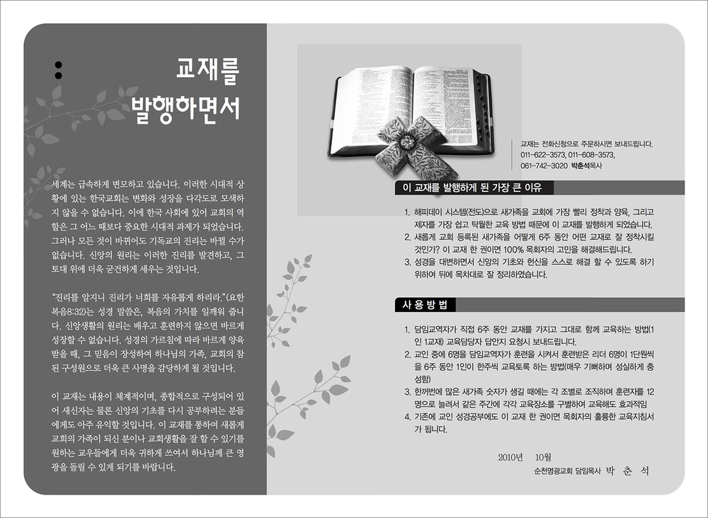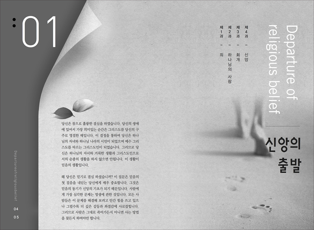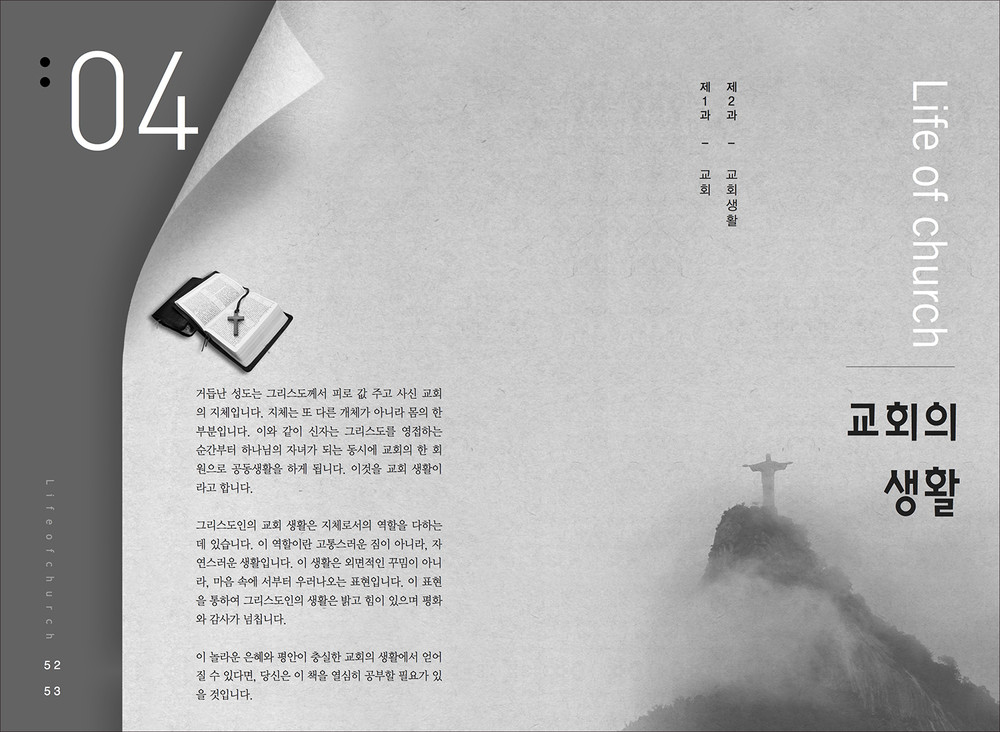 교회는 아주 다양한 행사와 교육이 이루어집니다. 추추감사절과 사순절에 이루어지는 새벽집회 묵상집, 새신자들을 위한 새신자 교재, 은혜에 감사하여 간증한 내용의 간증전도집 등 작고 간결한 디자인의 책자입니다.