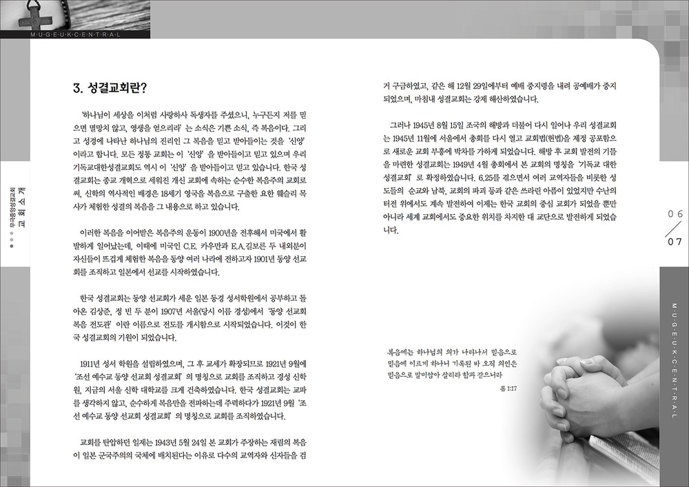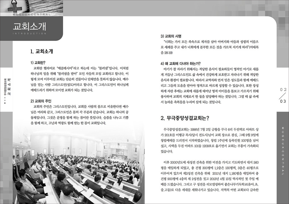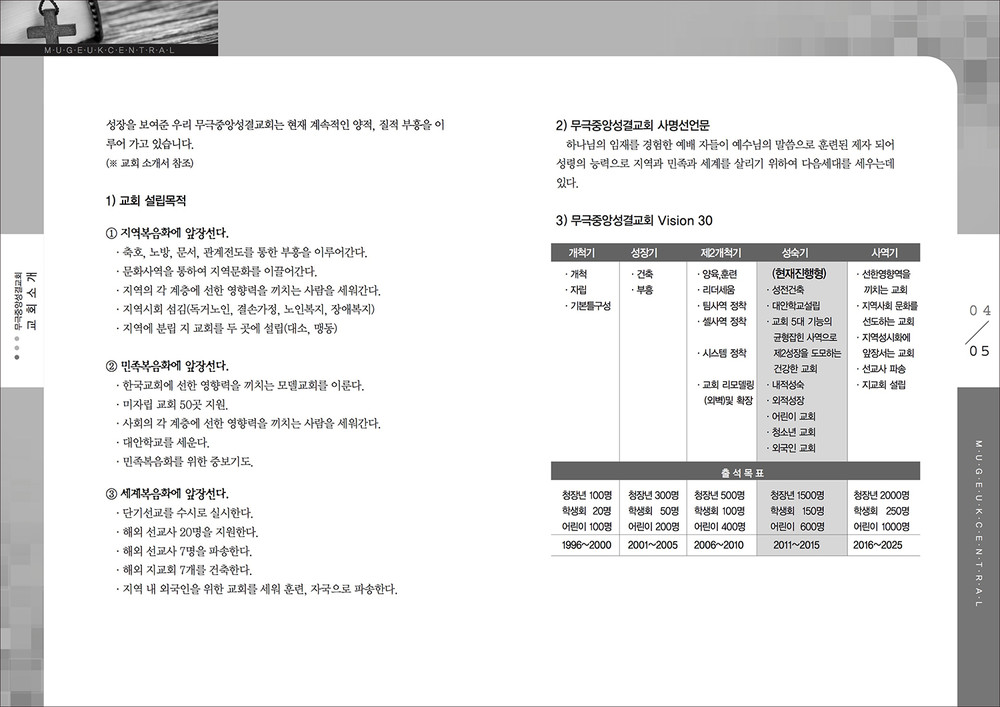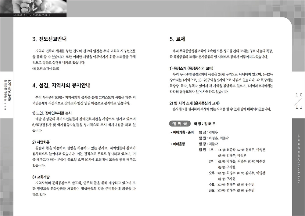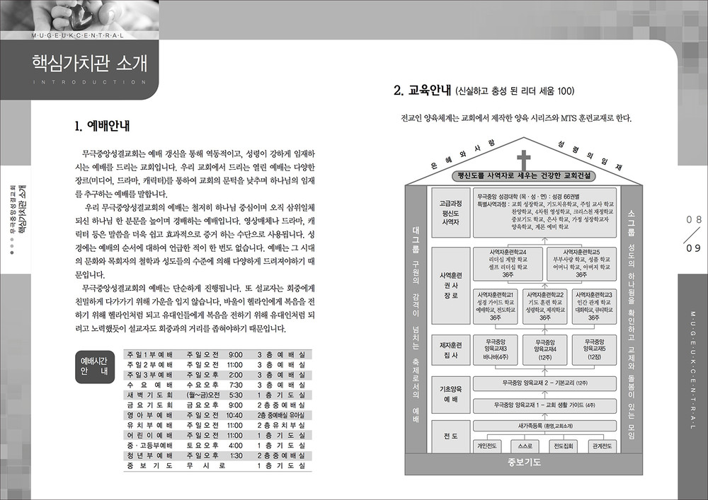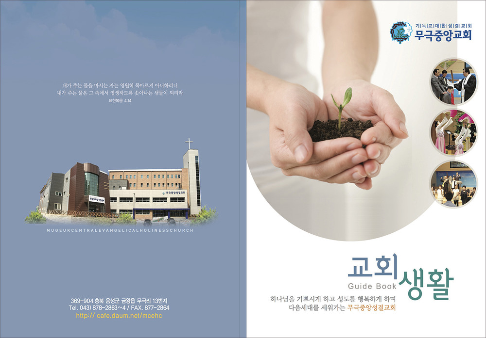 교회는 아주 다양한 행사와 교육이 이루어집니다. 추추감사절과 사순절에 이루어지는 새벽집회 묵상집, 새신자들을 위한 새신자 교재, 은혜에 감사하여 간증한 내용의 간증전도집 등 작고 간결한 디자인의 책자입니다.
