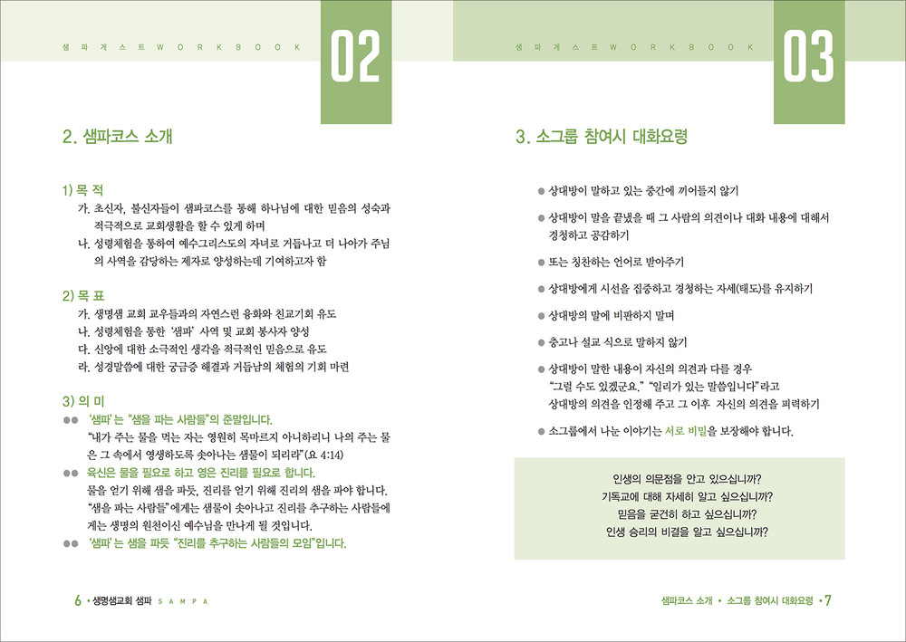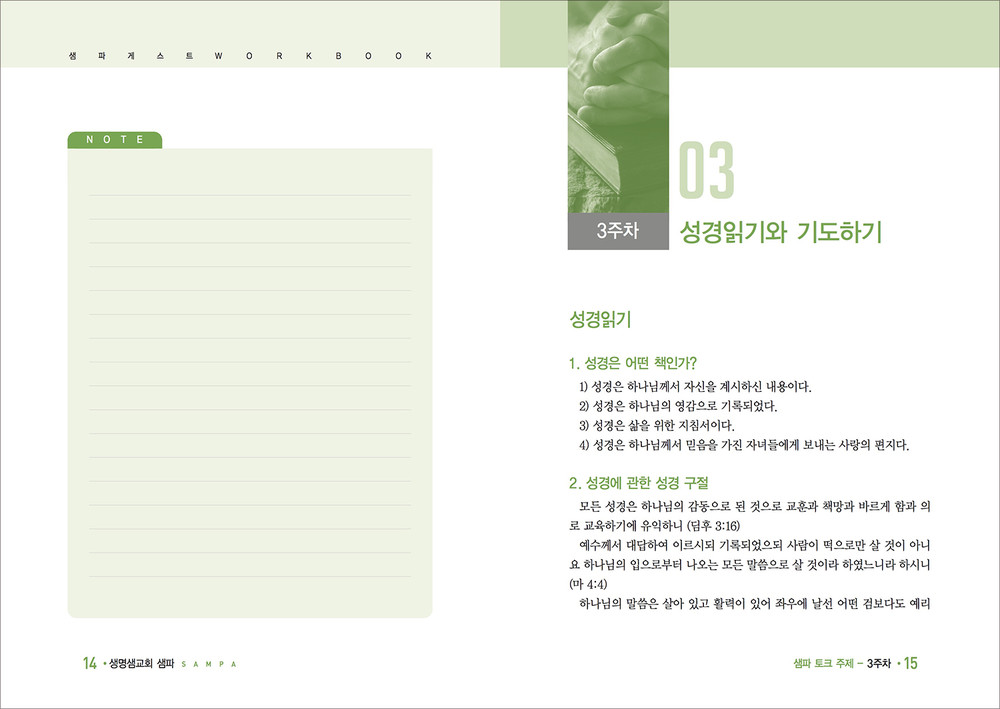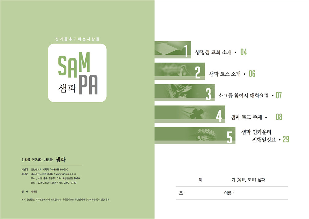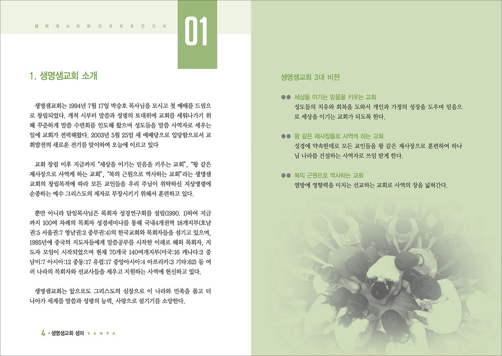 교회는 아주 다양한 행사와 교육이 이루어집니다. 추추감사절과 사순절에 이루어지는 새벽집회 묵상집, 새신자들을 위한 새신자 교재, 은혜에 감사하여 간증한 내용의 간증전도집 등 작고 간결한 디자인의 책자입니다.