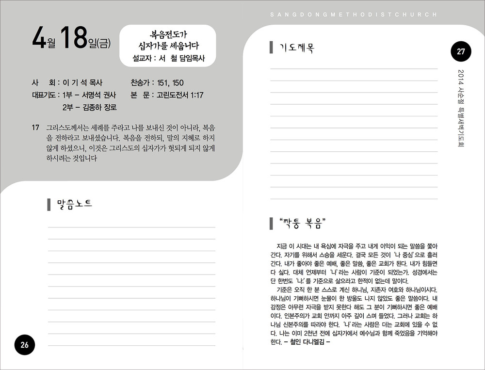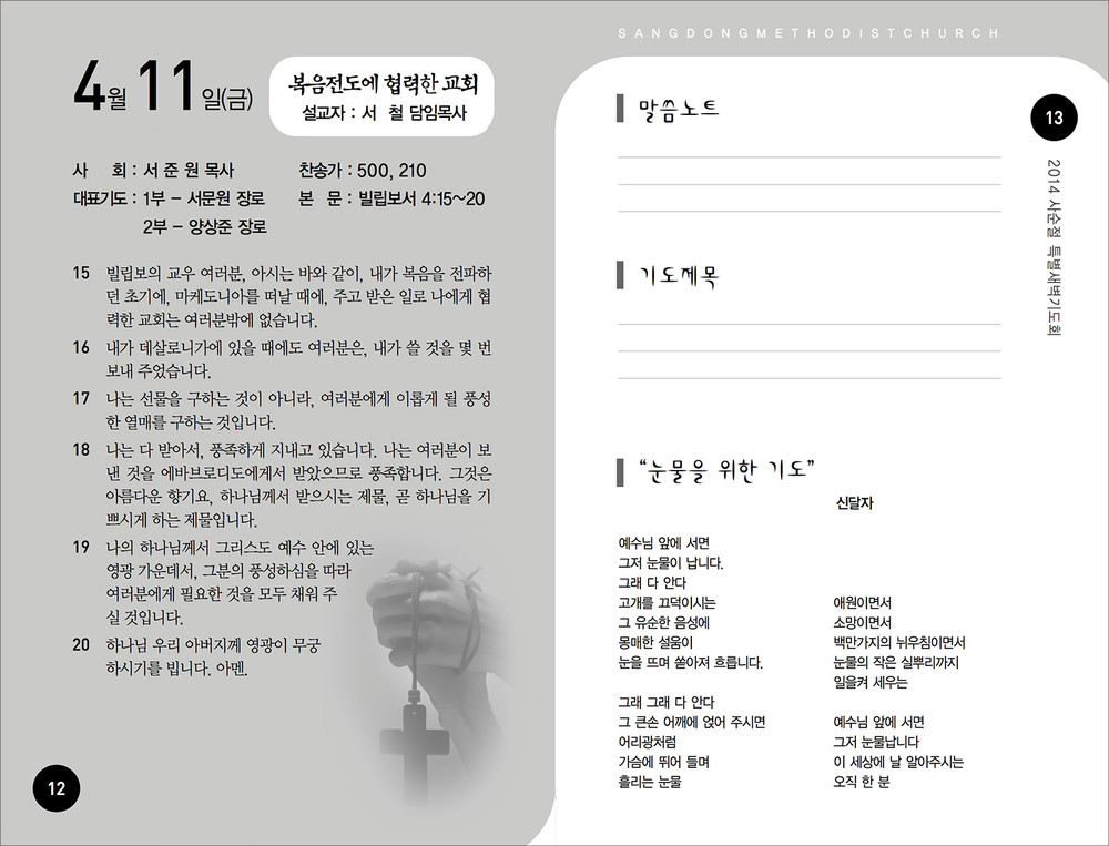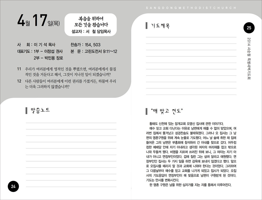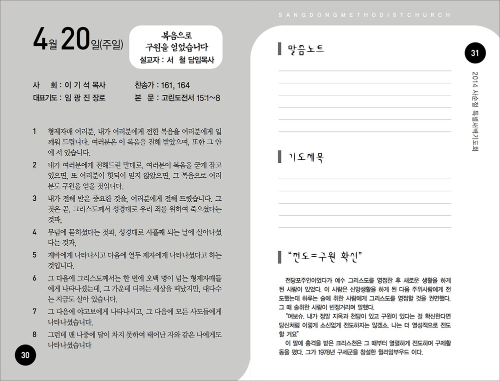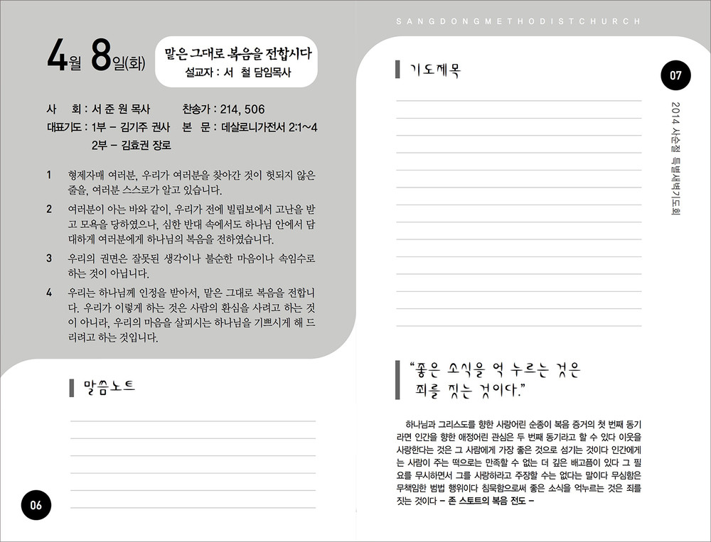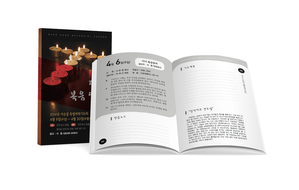 보통 교정을 컴퓨터 모니터나, 칼라 프린터로 출력해서 보시는 경우 모니터(빛의 색 RGB)와 인쇄물(잉크색 CMYK)에는 약간의 차이가 있습니다. 각 교회에서 사용되는 칼라 프린트도 옵셋 인쇄와는 인쇄 방식이 조금 달라 색상의 차이가 있습니다. 특히 종이의 재질(모조지, 아트지, 고급용지)에 의한 색의 차이도 발생할 수 있습니다.