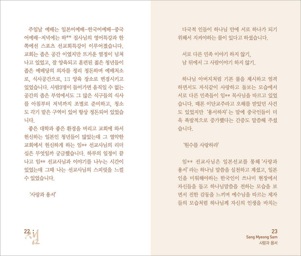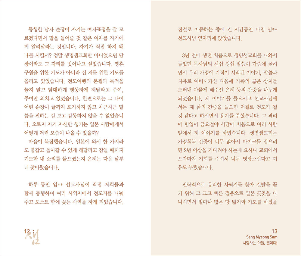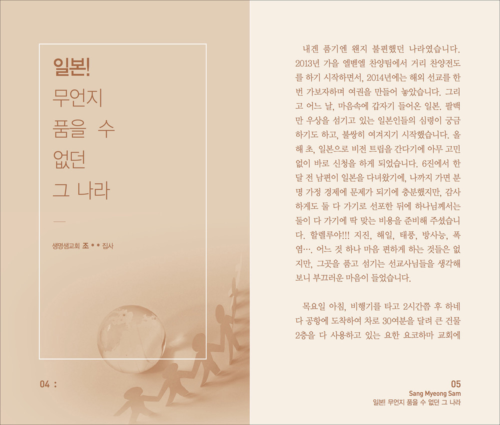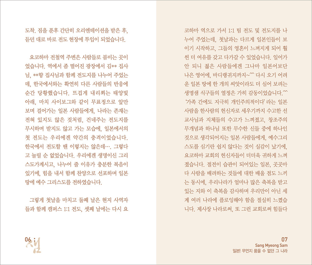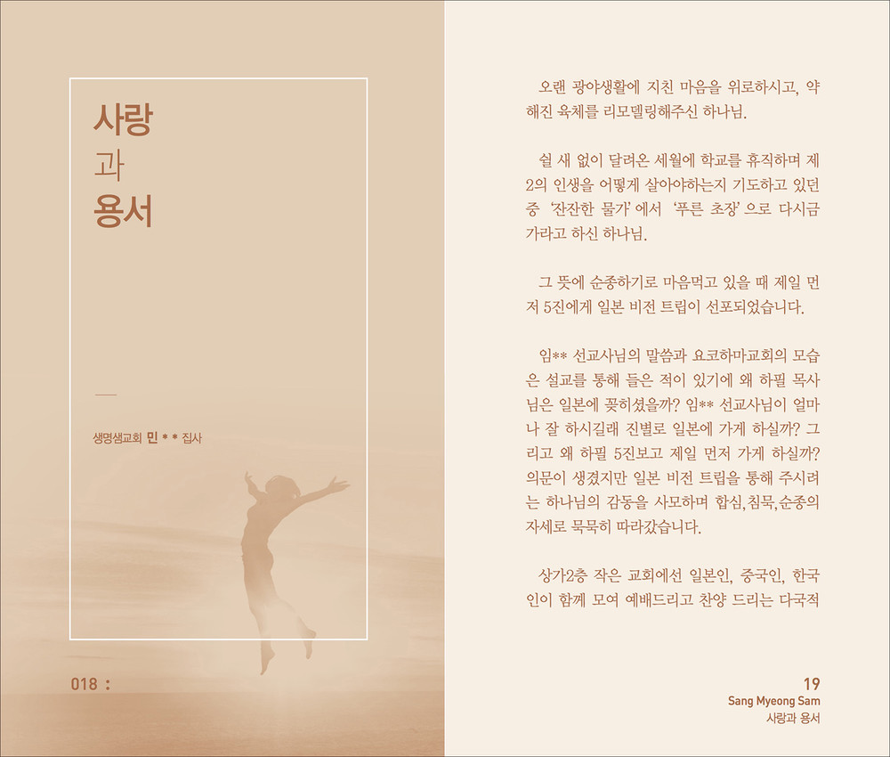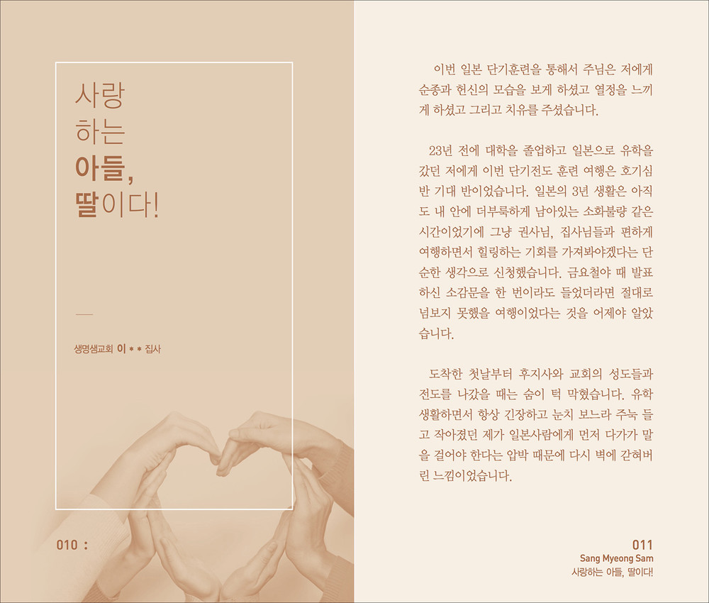 교회는 아주 다양한 행사와 교육이 이루어집니다. 추추감사절과 사순절에 이루어지는 새벽집회 묵상집, 새신자들을 위한 새신자 교재, 은혜에 감사하여 간증한 내용의 간증전도집 등 작고 간결한 디자인의 책자입니다.