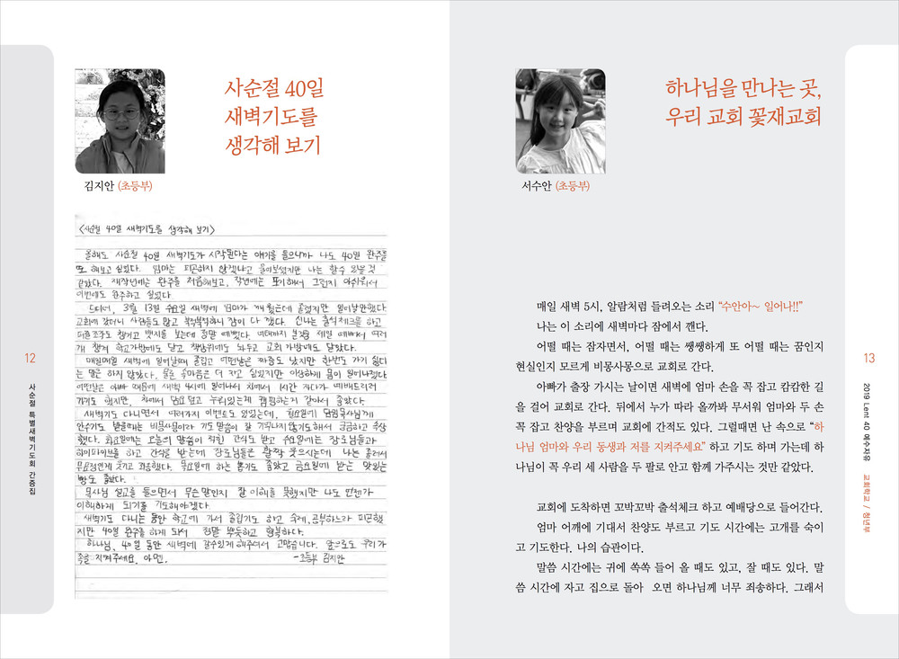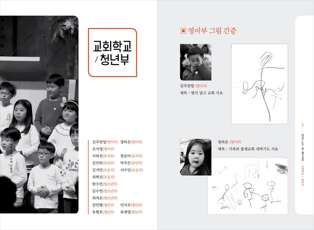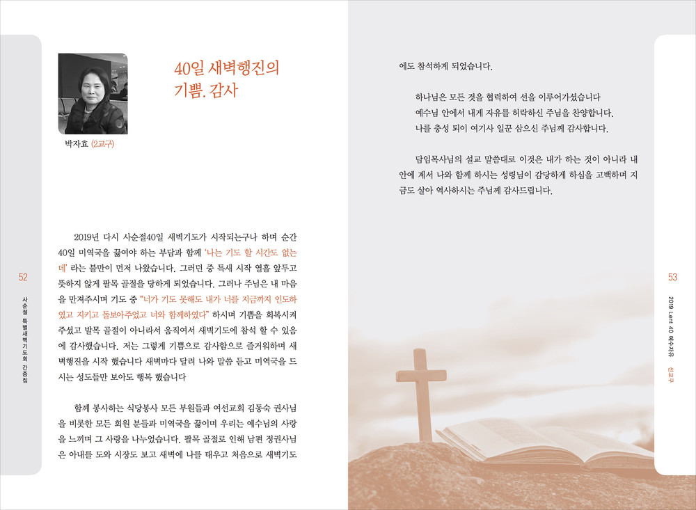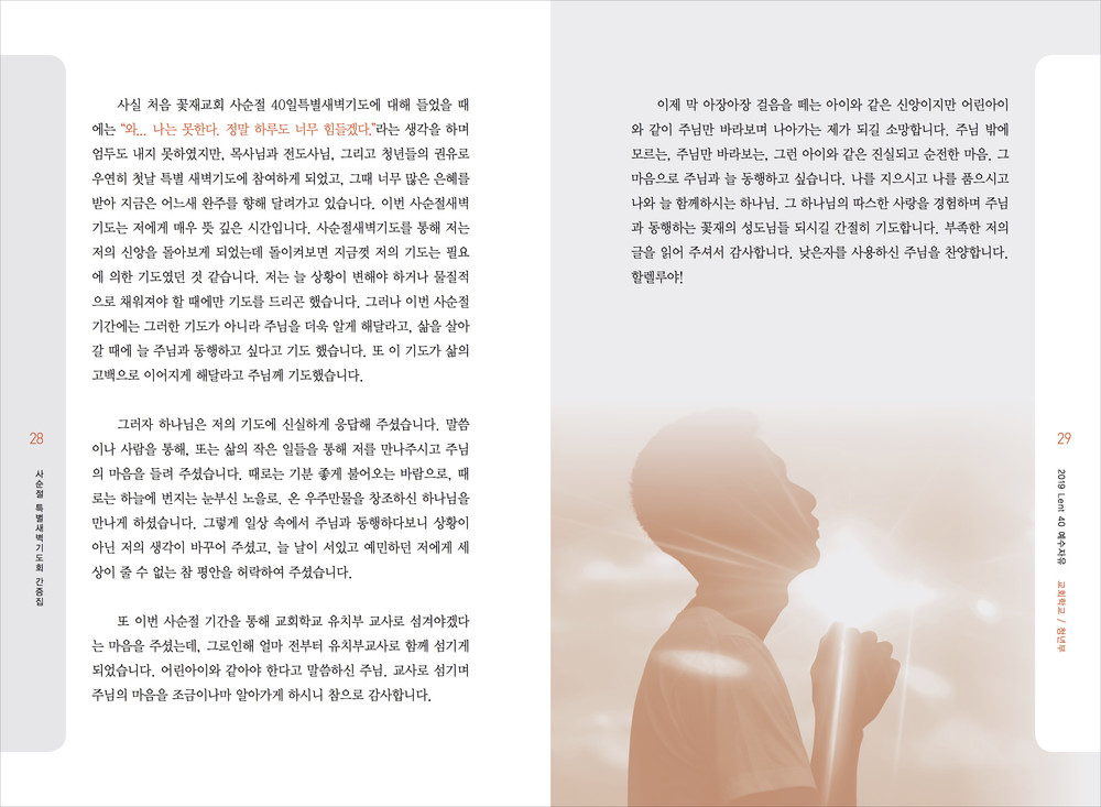 교회는 아주 다양한 행사와 교육이 이루어집니다. 추추감사절과 사순절에 이루어지는 새벽집회 묵상집, 새신자들을 위한 새신자 교재, 은혜에 감사하여 간증한 내용의 간증전도집 등 작고 간결한 디자인의 책자입니다.