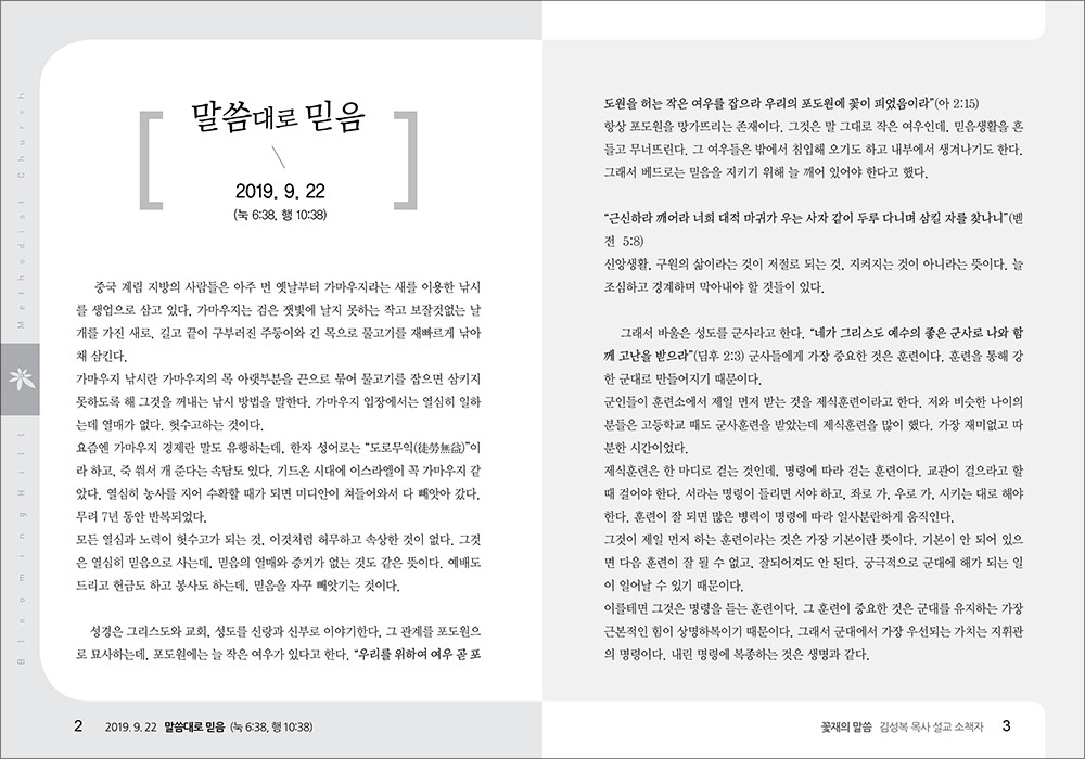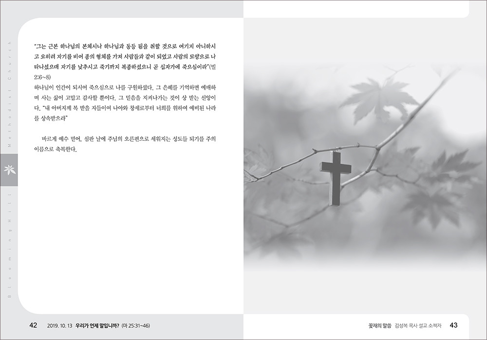 보통 교정을 컴퓨터 모니터나, 칼라 프린터로 출력해서 보시는 경우 모니터(빛의 색 RGB)와 인쇄물(잉크색 CMYK)에는 약간의 차이가 있습니다. 각 교회에서 사용되는 칼라 프린트도 옵셋 인쇄와는 인쇄 방식이 조금 달라 색상의 차이가 있습니다. 특히 종이의 재질(모조지, 아트지, 고급용지)에 의한 색의 차이도 발생할 수 있습니다.