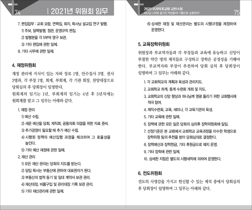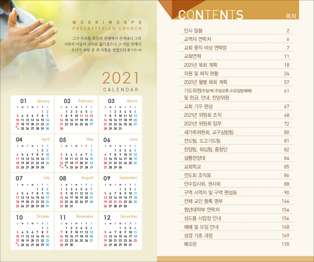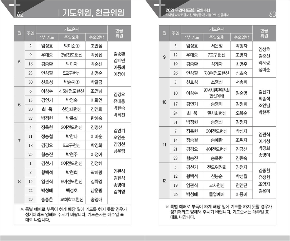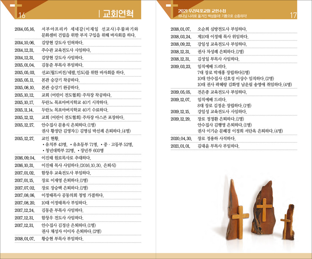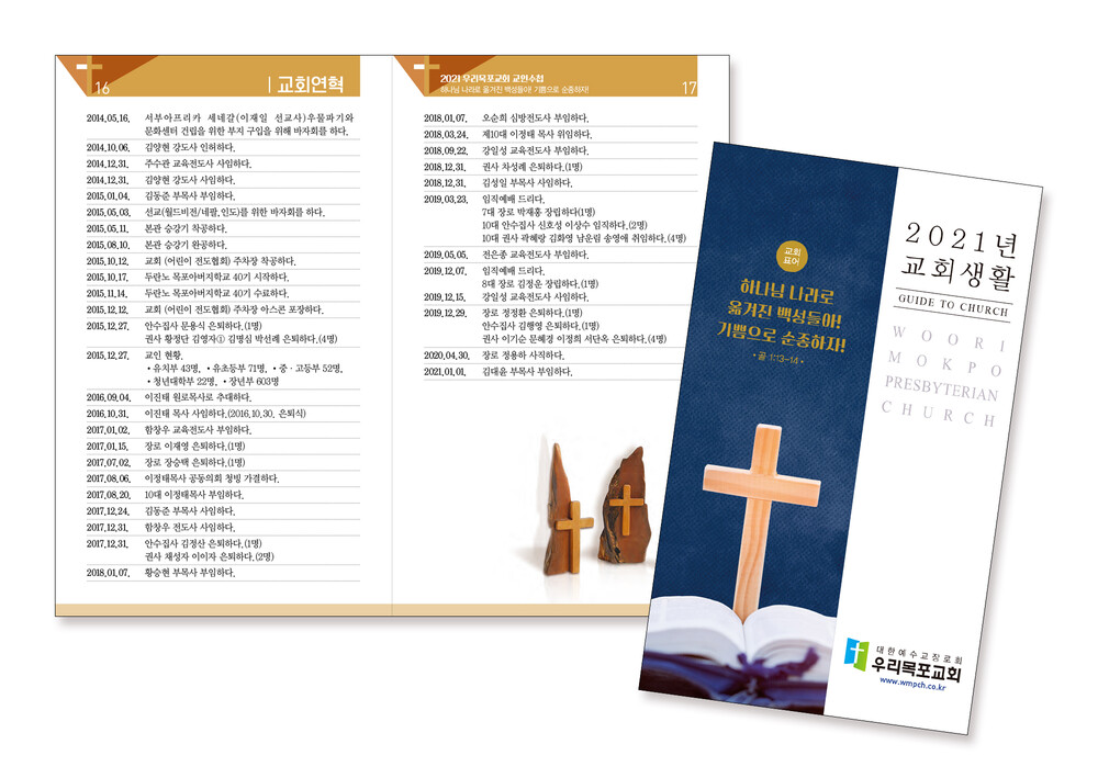 해마다 연초가 되면 교회에서 요람이나 수첩 등을 나누어 줍니다. 하지만 받고나면 한번보곤 말지요. 필요가 없어서일 수도 있지만 복잡하고 어수선한 이유일 수도 있습니다. 저희 그리심에서는 일정한 편집과 디자인으로 제작해 드립니다. 매년 제작하다보면 요람이나 수첩이 작은 역사책이 되어 우리교회의 역사를 아는데 많은 도움이 되곤합니다.