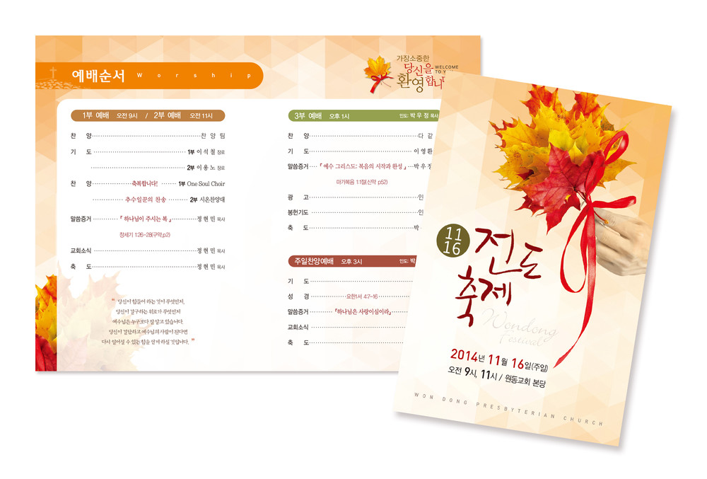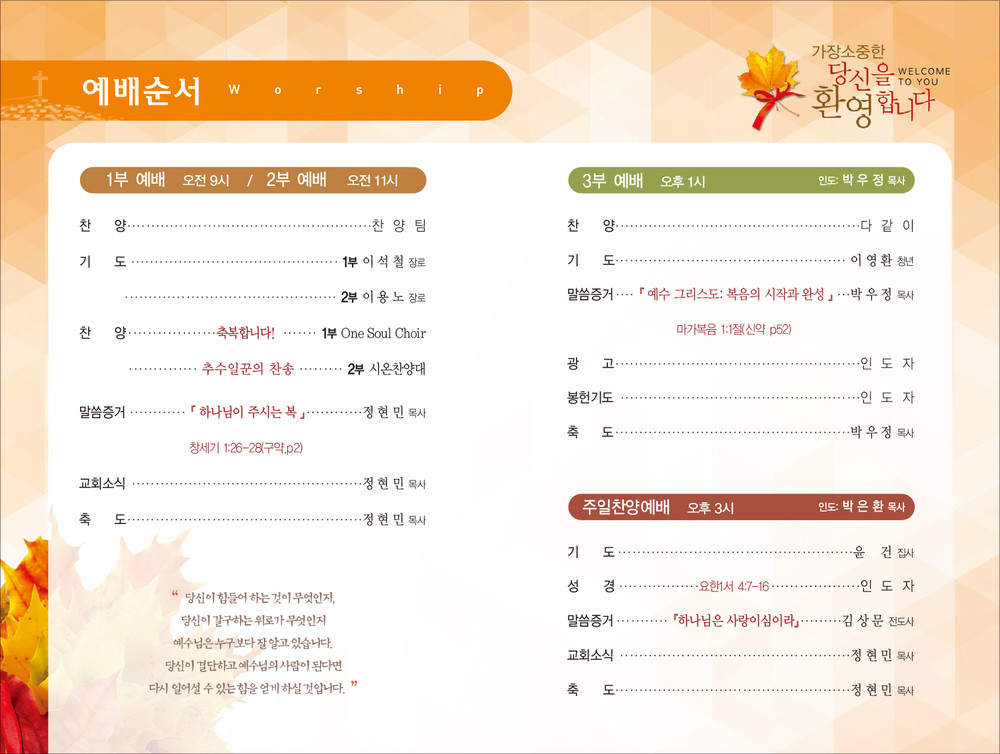 보통 교정을 컴퓨터 모니터나, 칼라 프린터로 출력해서 보시는 경우 모니터(빛의 색 RGB)와 인쇄물(잉크색 CMYK)에는 약간의 차이가 있습니다. 각 교회에서 사용되는 칼라 프린트도 옵셋 인쇄와는 인쇄 방식이 조금 달라 색상의 차이가 있습니다. 특히 종이의 재질(모조지, 아트지, 고급용지)에 의한 색의 차이도 발생할 수 있습니다.