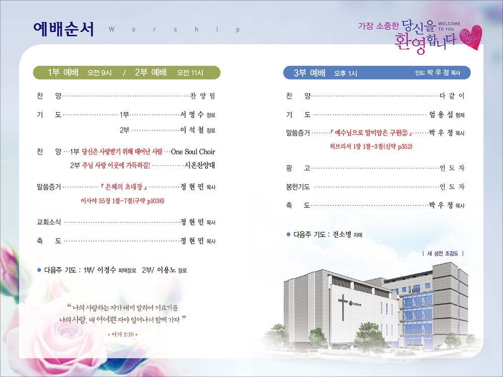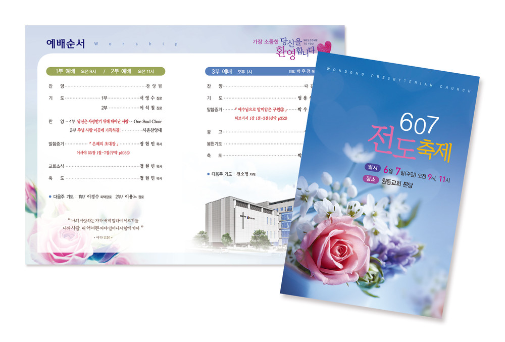 보통 교정을 컴퓨터 모니터나, 칼라 프린터로 출력해서 보시는 경우 모니터(빛의 색 RGB)와 인쇄물(잉크색 CMYK)에는 약간의 차이가 있습니다. 각 교회에서 사용되는 칼라 프린트도 옵셋 인쇄와는 인쇄 방식이 조금 달라 색상의 차이가 있습니다. 특히 종이의 재질(모조지, 아트지, 고급용지)에 의한 색의 차이도 발생할 수 있습니다.