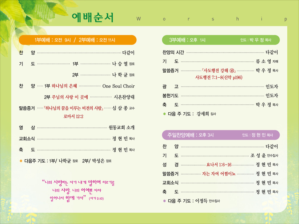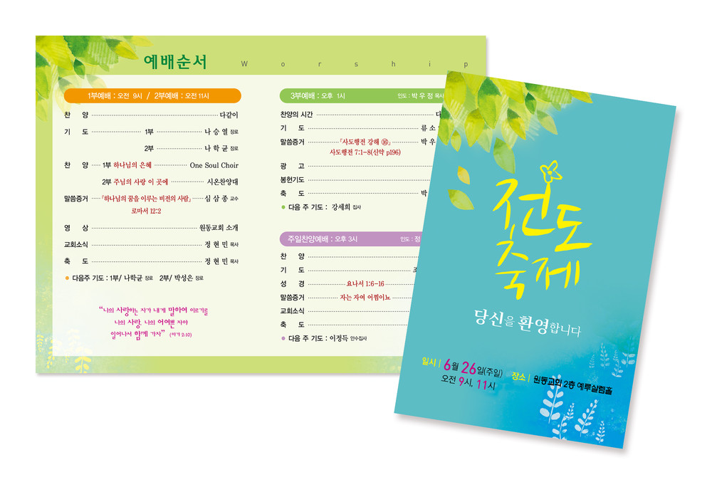 보통 교정을 컴퓨터 모니터나, 칼라 프린터로 출력해서 보시는 경우 모니터(빛의 색 RGB)와 인쇄물(잉크색 CMYK)에는 약간의 차이가 있습니다. 각 교회에서 사용되는 칼라 프린트도 옵셋 인쇄와는 인쇄 방식이 조금 달라 색상의 차이가 있습니다. 특히 종이의 재질(모조지, 아트지, 고급용지)에 의한 색의 차이도 발생할 수 있습니다.