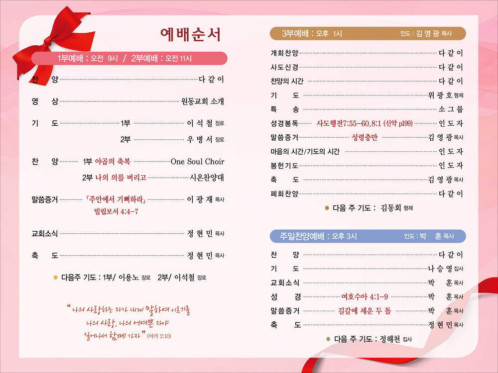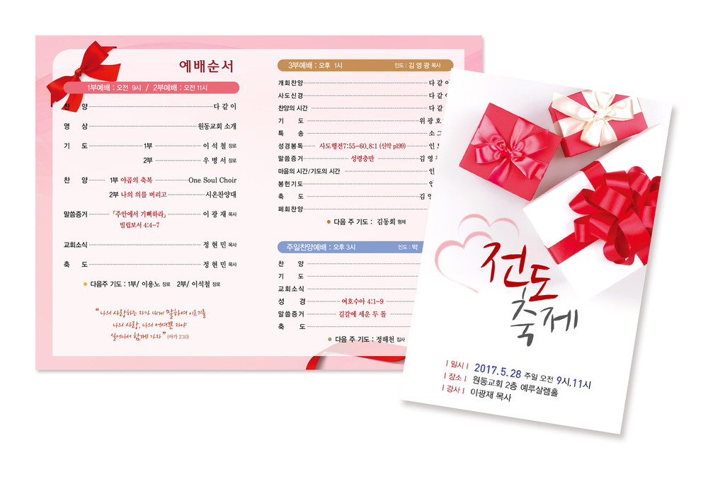보통 교정을 컴퓨터 모니터나, 칼라 프린터로 출력해서 보시는 경우 모니터(빛의 색 RGB)와 인쇄물(잉크색 CMYK)에는 약간의 차이가 있습니다. 각 교회에서 사용되는 칼라 프린트도 옵셋 인쇄와는 인쇄 방식이 조금 달라 색상의 차이가 있습니다. 특히 종이의 재질(모조지, 아트지, 고급용지)에 의한 색의 차이도 발생할 수 있습니다.