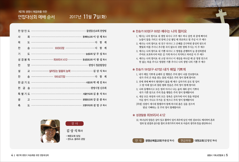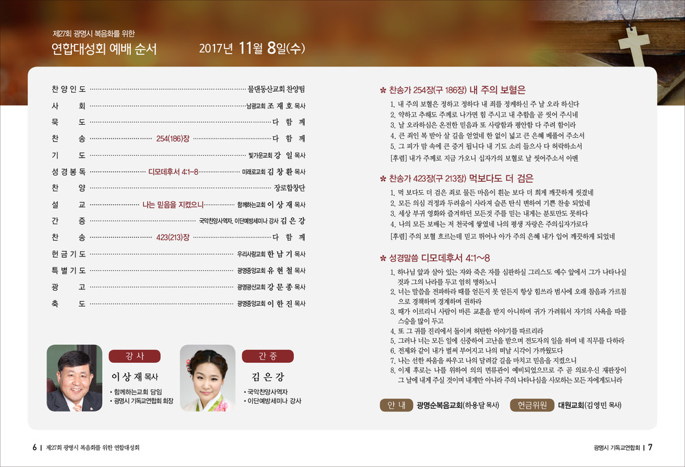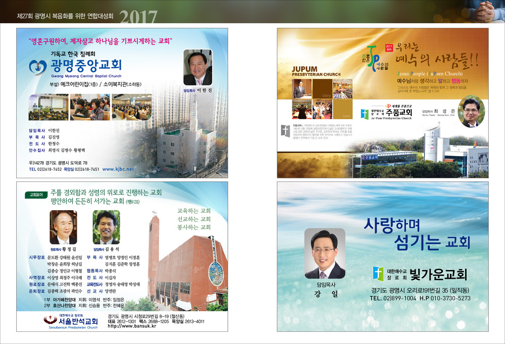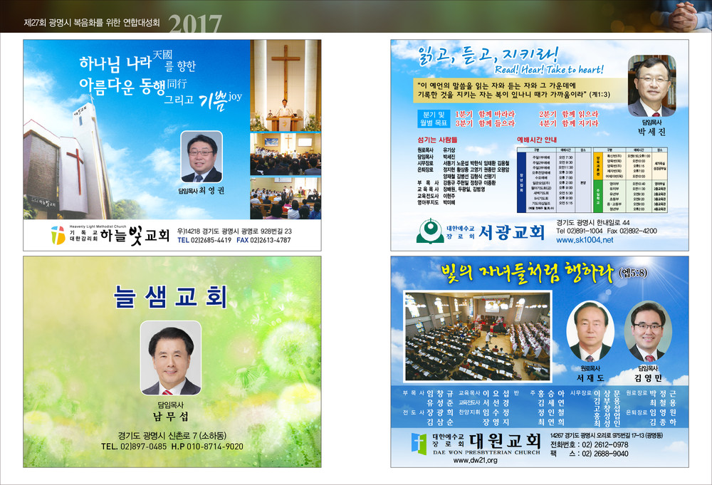 보통 교정을 컴퓨터 모니터나, 칼라 프린터로 출력해서 보시는 경우 모니터(빛의 색 RGB)와 인쇄물(잉크색 CMYK)에는 약간의 차이가 있습니다. 각 교회에서 사용되는 칼라 프린트도 옵셋 인쇄와는 인쇄 방식이 조금 달라 색상의 차이가 있습니다. 특히 종이의 재질(모조지, 아트지, 고급용지)에 의한 색의 차이도 발생할 수 있습니다.