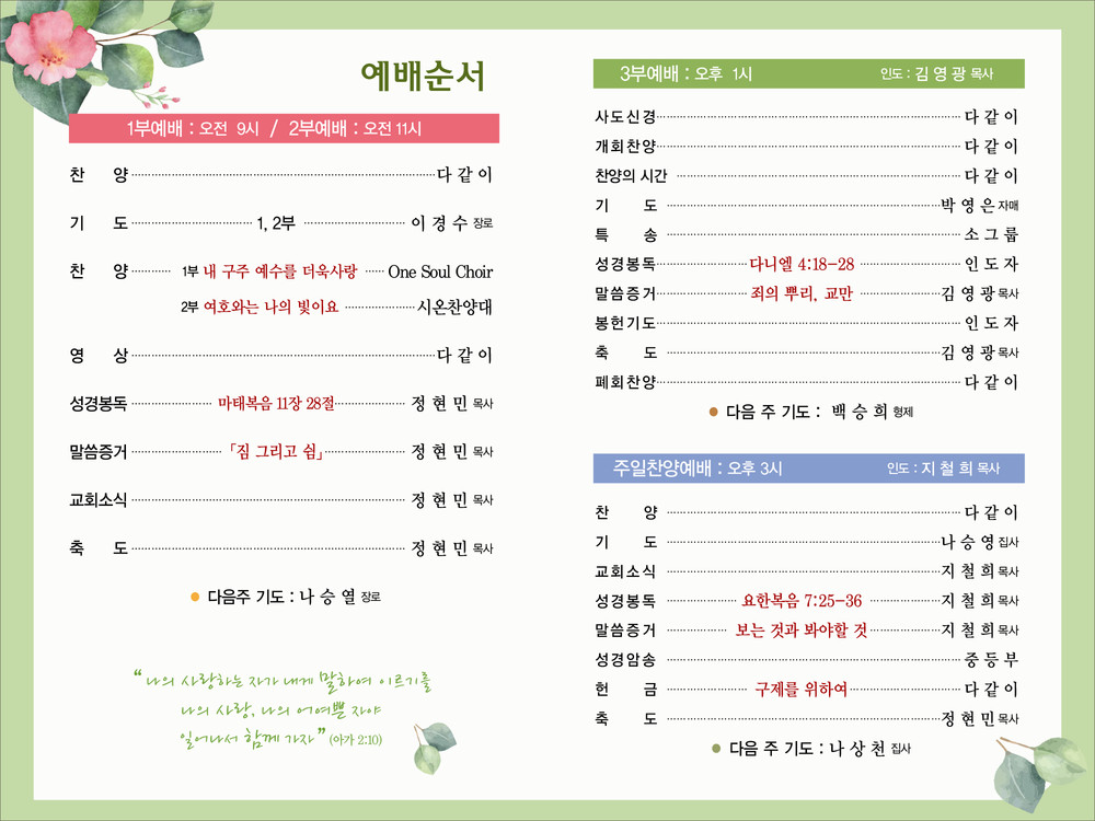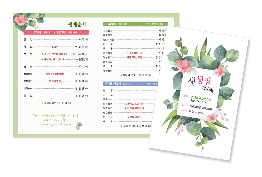 보통 교정을 컴퓨터 모니터나, 칼라 프린터로 출력해서 보시는 경우 모니터(빛의 색 RGB)와 인쇄물(잉크색 CMYK)에는 약간의 차이가 있습니다. 각 교회에서 사용되는 칼라 프린트도 옵셋 인쇄와는 인쇄 방식이 조금 달라 색상의 차이가 있습니다. 특히 종이의 재질(모조지, 아트지, 고급용지)에 의한 색의 차이도 발생할 수 있습니다.