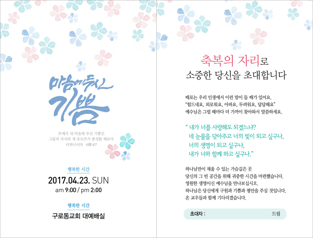 저희 그리심에서 디자인에 더 많은 신경을 쓰다보면 오·탈자를 미처 확인 못할 때가 있습니다. 특히 내용을 전화로 불러주시거나 부득이하게 텍스트를 저희가 타이핑했을 경우 더욱 철저하게 교정을 봐주셔야 합니다.