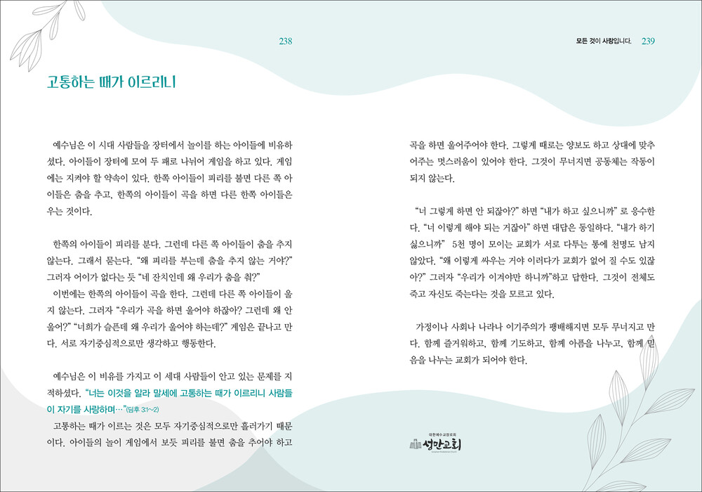 보통 교정을 컴퓨터 모니터나, 칼라 프린터로 출력해서 보시는 경우 모니터(빛의 색 RGB)와 인쇄물(잉크색 CMYK)에는 약간의 차이가 있습니다. 각 교회에서 사용되는 칼라 프린트도 옵셋 인쇄와는 인쇄 방식이 조금 달라 색상의 차이가 있습니다. 특히 종이의 재질(모조지, 아트지, 고급용지)에 의한 색의 차이도 발생할 수 있습니다.