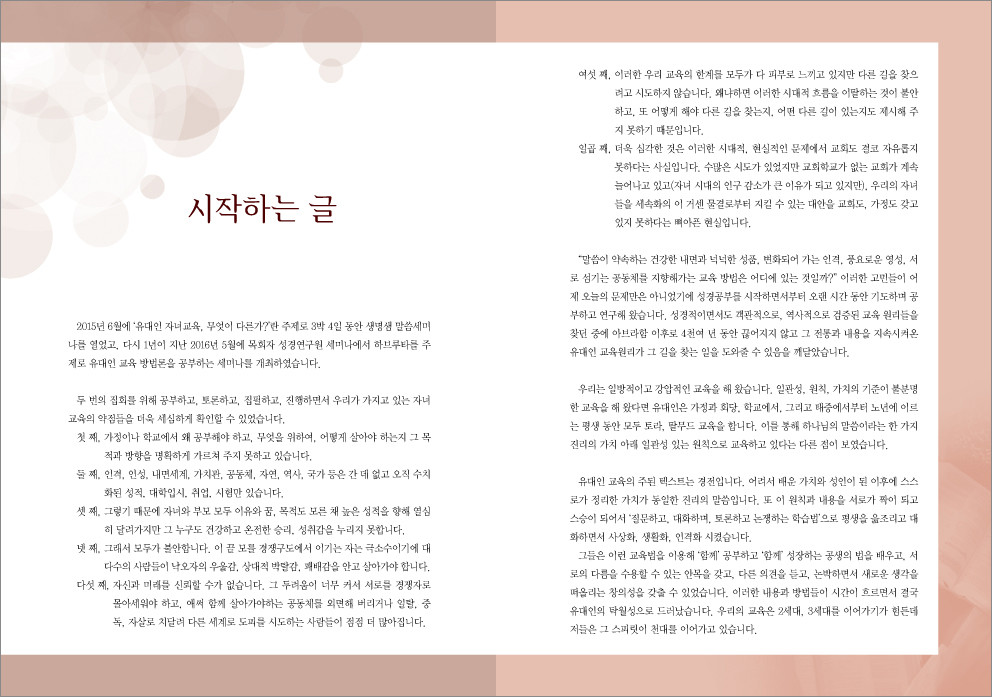 교회는 교육으로 신실한 크리스천을 세우며, 새루운 신자를 양육하고 교육하여 하나님의 자녀들로 키우는 곳입니다. 각 교회별로 특성에 맞는 교재를 만들어 사용하고 있으나 디자인이 조잡하여 교육에 장애가 되는 경우가 있습니다. 저희 그리심에서는 좋은 디자인의 교재를 제작해 드립니다.
