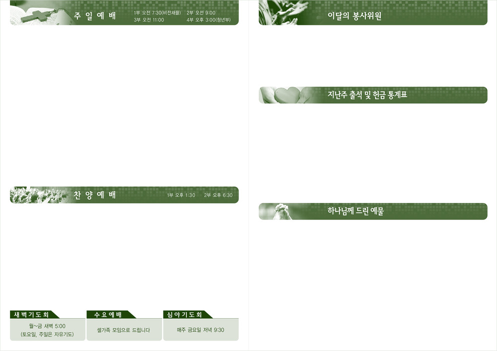 모든 디자인이 완료된 후 현재 교회가 사용중인 한글파일을 보내주시면, 새로운 주보에 맞추어 인쇄가 가능하도록 한글파일을 제작해드리고 있습니다. (한글작업 요청시 약 1-3일 정도의 시간이 소요되오니 참고해 주시기 바랍니다.)