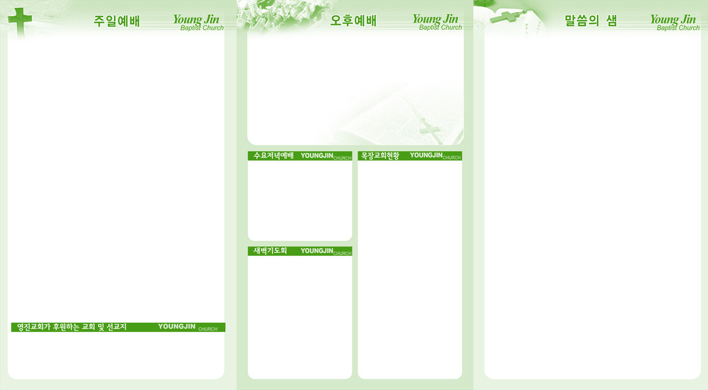 모든 디자인이 완료된 후 현재 교회가 사용중인 한글파일을 보내주시면, 새로운 주보에 맞추어 인쇄가 가능하도록 한글파일을 제작해드리고 있습니다. (한글작업 요청시 약 1-3일 정도의 시간이 소요되오니 참고해 주시기 바랍니다.)