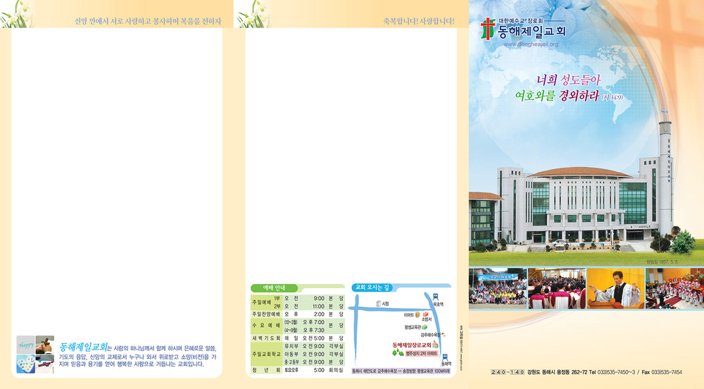 모든 디자인이 완료된 후 현재 교회가 사용중인 한글파일을 보내주시면, 새로운 주보에 맞추어 인쇄가 가능하도록 한글파일을 제작해드리고 있습니다. (한글작업 요청시 약 1-3일 정도의 시간이 소요되오니 참고해 주시기 바랍니다.)