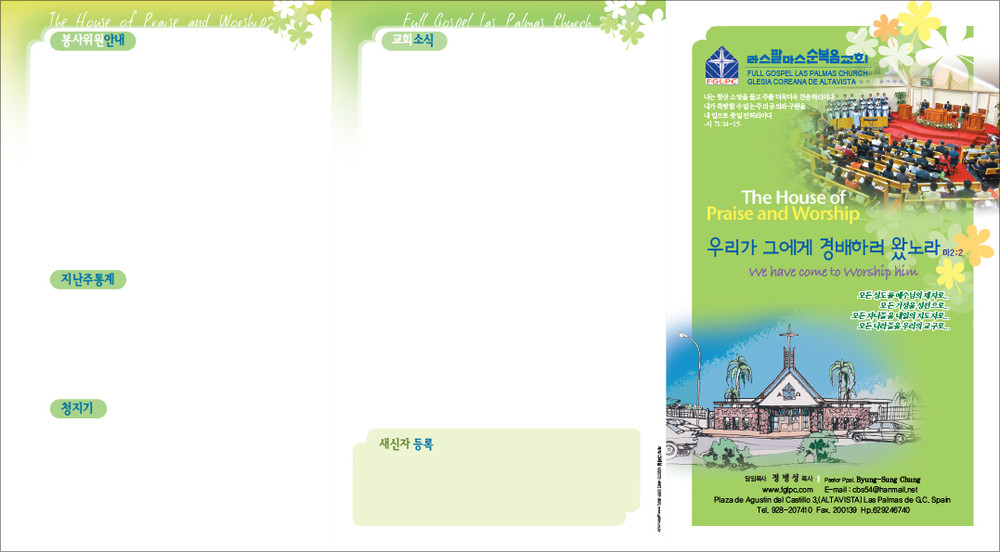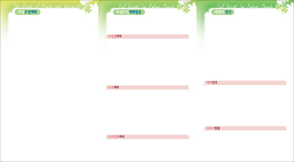 모든 디자인이 완료된 후 현재 교회가 사용중인 한글파일을 보내주시면, 새로운 주보에 맞추어 인쇄가 가능하도록 한글파일을 제작해드리고 있습니다. (한글작업 요청시 약 1-3일 정도의 시간이 소요되오니 참고해 주시기 바랍니다.)