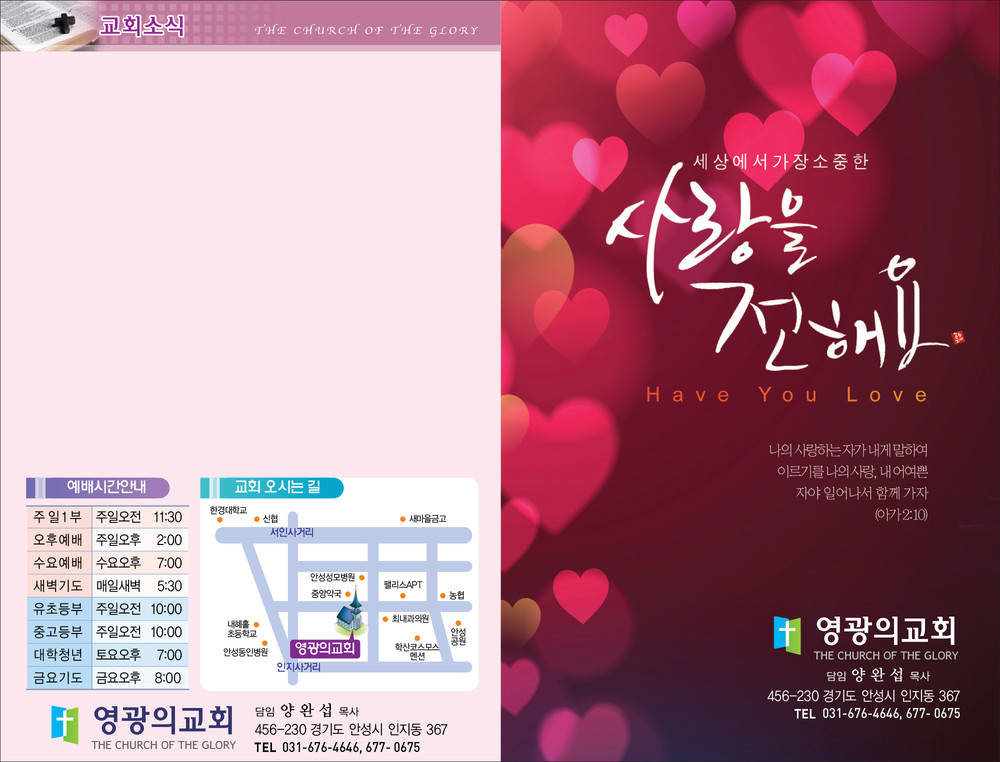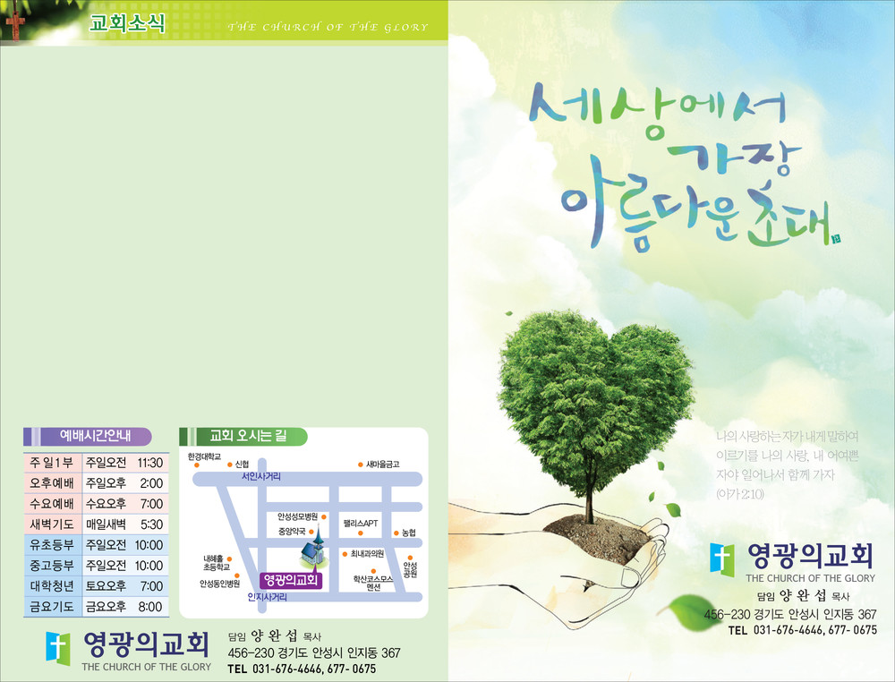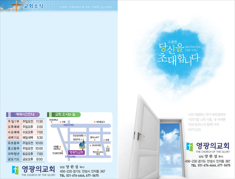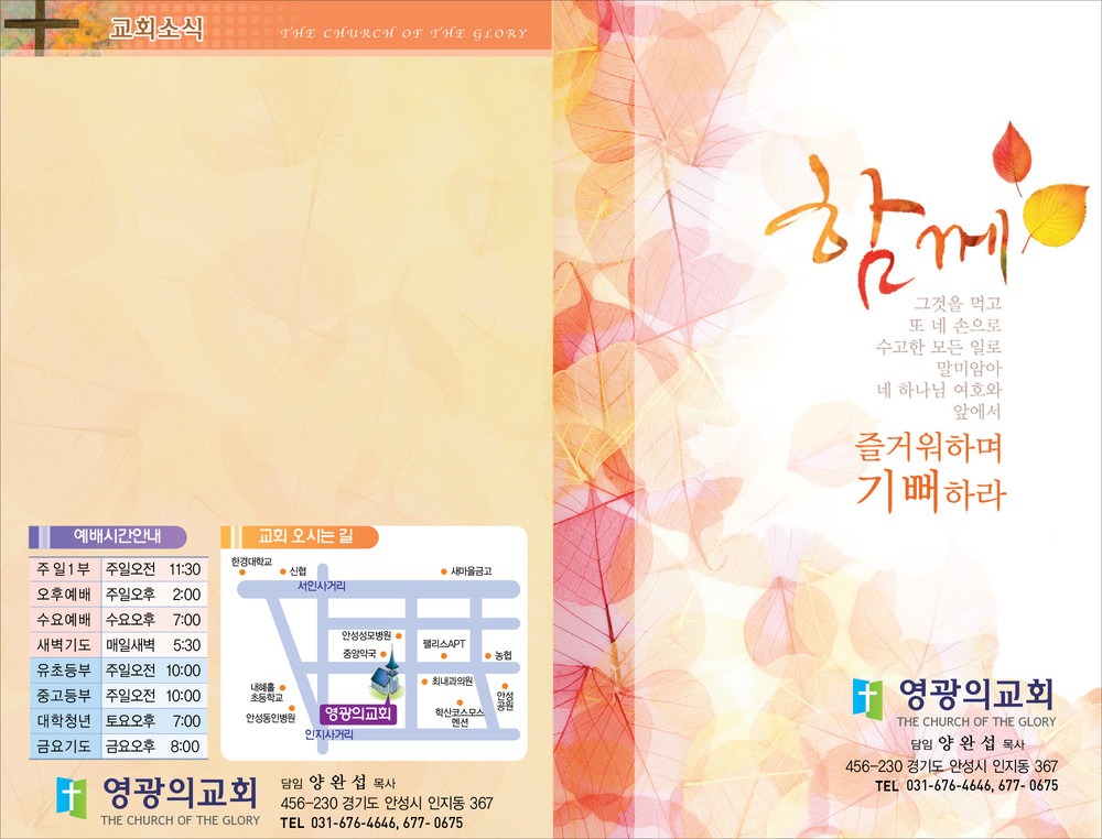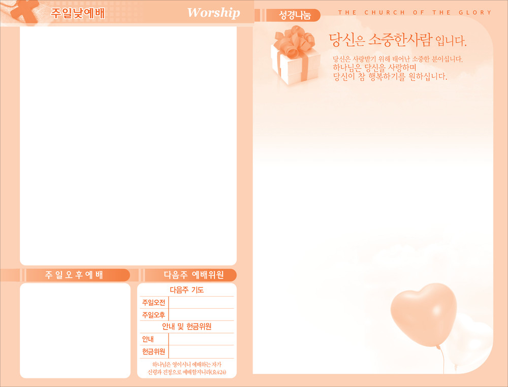 모든 디자인이 완료된 후 현재 교회가 사용중인 한글파일을 보내주시면, 새로운 주보에 맞추어 인쇄가 가능하도록 한글파일을 제작해드리고 있습니다. (한글작업 요청시 약 1-3일 정도의 시간이 소요되오니 참고해 주시기 바랍니다.)