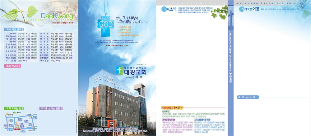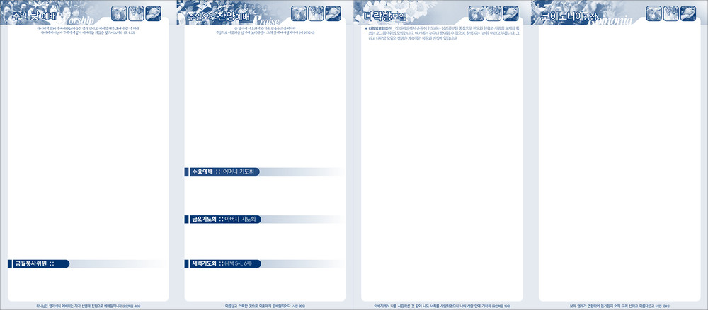 모든 디자인이 완료된 후 현재 교회가 사용중인 한글파일을 보내주시면, 새로운 주보에 맞추어 인쇄가 가능하도록 한글파일을 제작해드리고 있습니다. (한글작업 요청시 약 1-3일 정도의 시간이 소요되오니 참고해 주시기 바랍니다.)