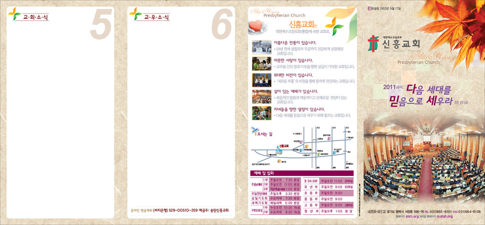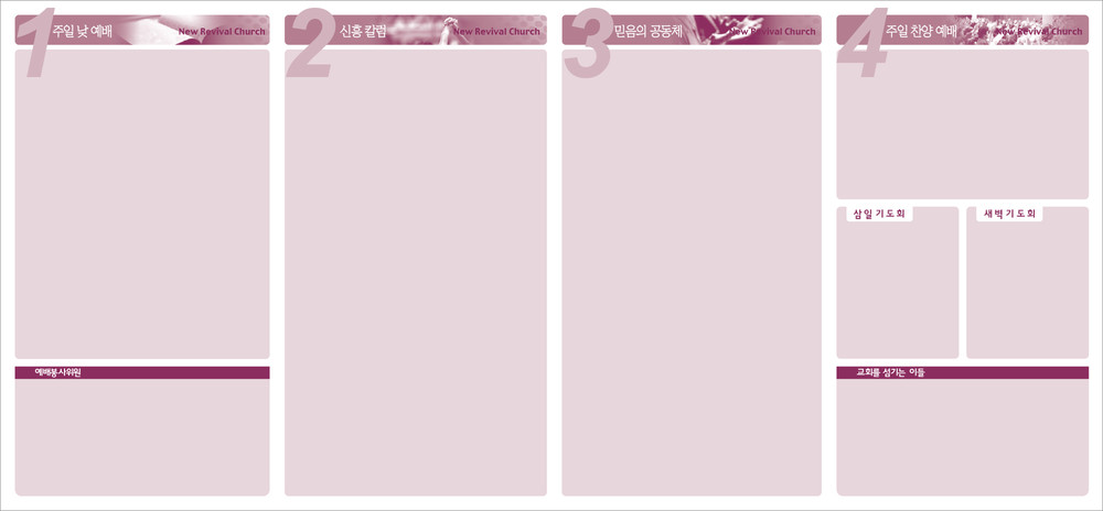 모든 디자인이 완료된 후 현재 교회가 사용중인 한글파일을 보내주시면, 새로운 주보에 맞추어 인쇄가 가능하도록 한글파일을 제작해드리고 있습니다. (한글작업 요청시 약 1-3일 정도의 시간이 소요되오니 참고해 주시기 바랍니다.)