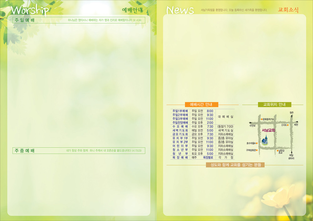 모든 디자인이 완료된 후 현재 교회가 사용중인 한글파일을 보내주시면, 새로운 주보에 맞추어 인쇄가 가능하도록 한글파일을 제작해드리고 있습니다. (한글작업 요청시 약 1-3일 정도의 시간이 소요되오니 참고해 주시기 바랍니다.)