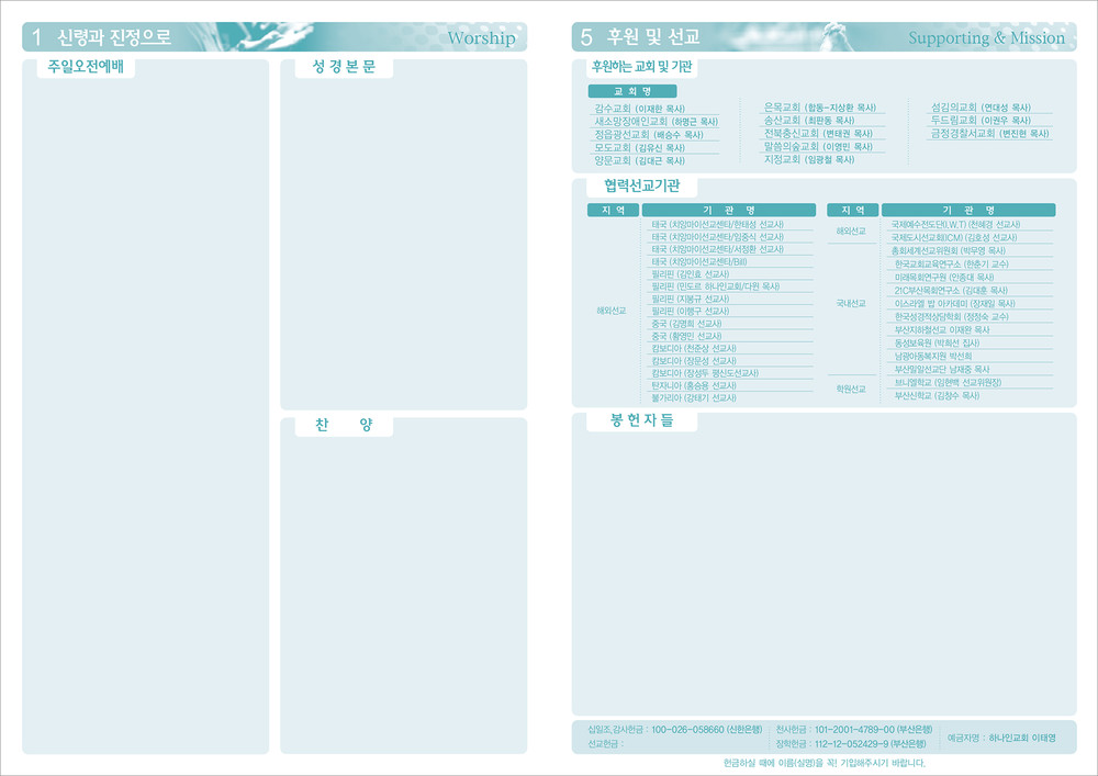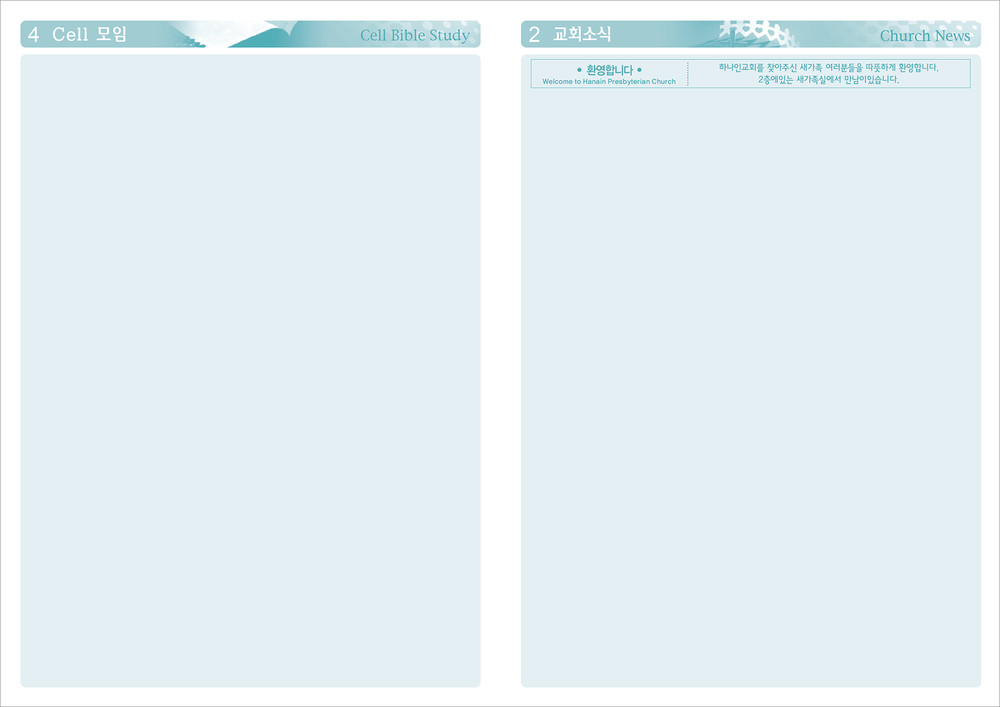모든 디자인이 완료된 후 현재 교회가 사용중인 한글파일을 보내주시면, 새로운 주보에 맞추어 인쇄가 가능하도록 한글파일을 제작해드리고 있습니다. (한글작업 요청시 약 1-3일 정도의 시간이 소요되오니 참고해 주시기 바랍니다.)