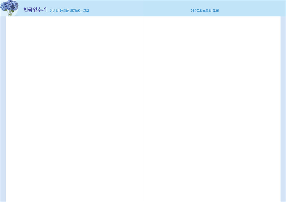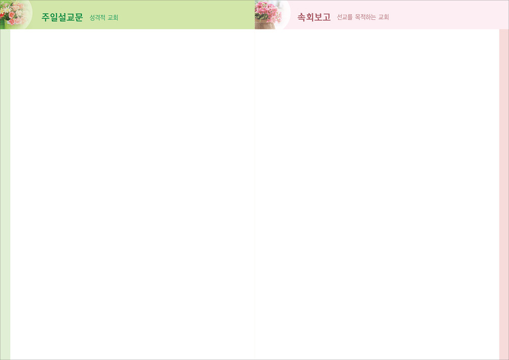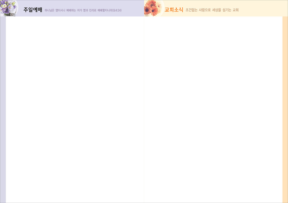 모든 디자인이 완료된 후 현재 교회가 사용중인 한글파일을 보내주시면, 새로운 주보에 맞추어 인쇄가 가능하도록 한글파일을 제작해드리고 있습니다. (한글작업 요청시 약 1-3일 정도의 시간이 소요되오니 참고해 주시기 바랍니다.)