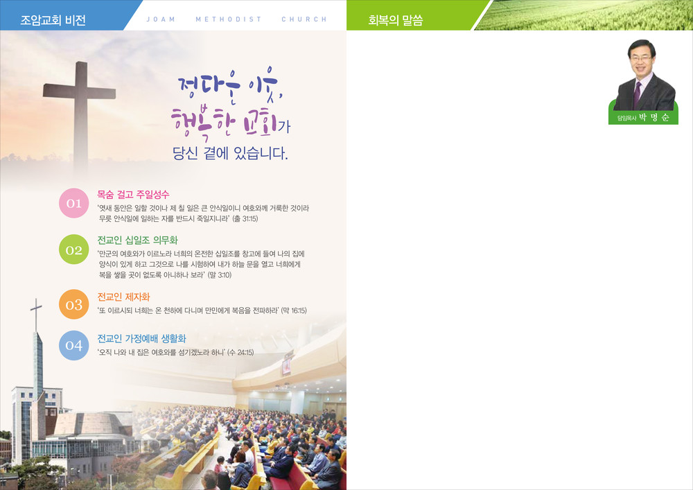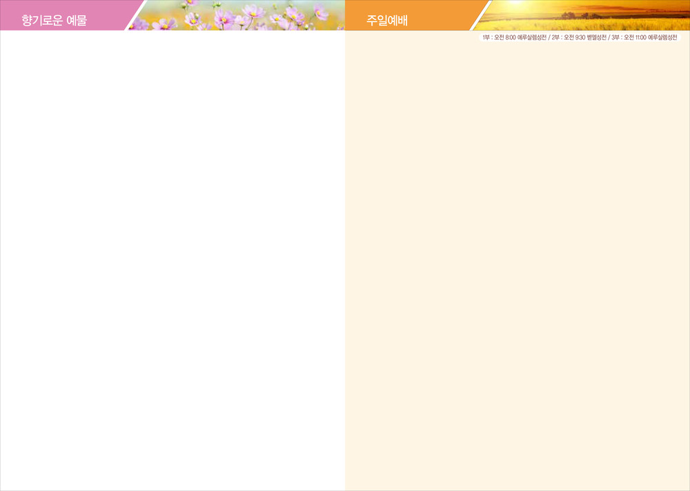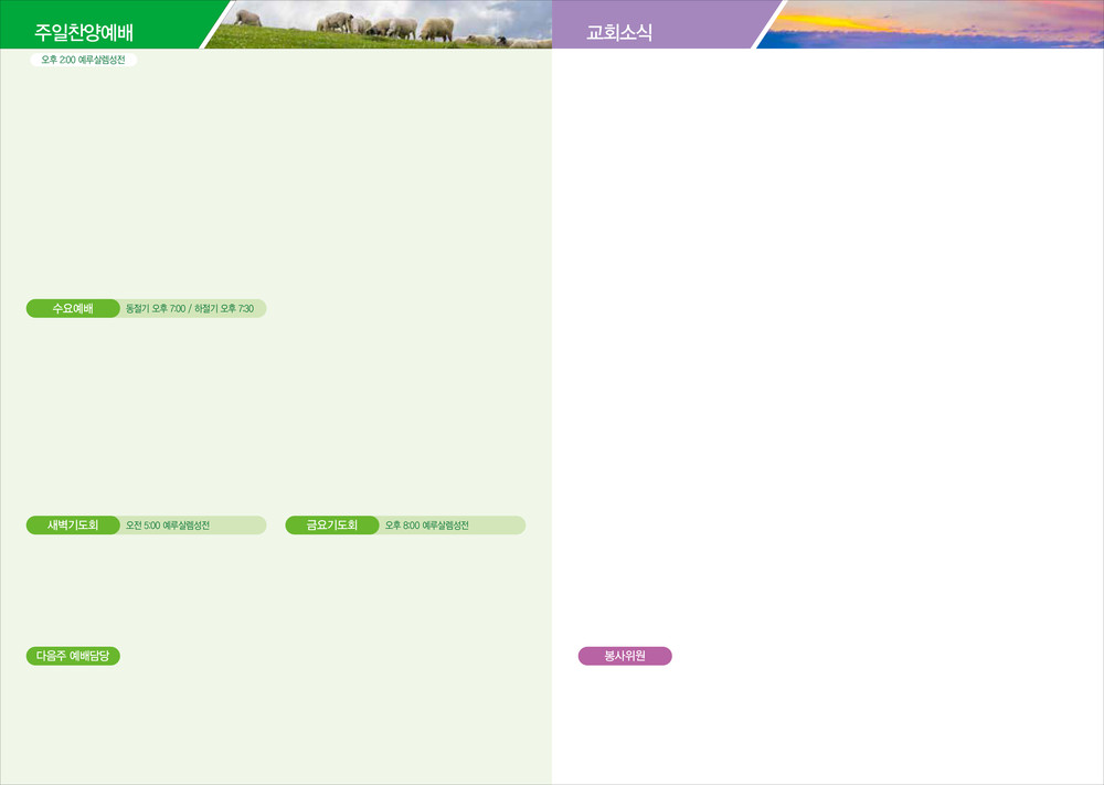 모든 디자인이 완료된 후 현재 교회가 사용중인 한글파일을 보내주시면, 새로운 주보에 맞추어 인쇄가 가능하도록 한글파일을 제작해드리고 있습니다. (한글작업 요청시 약 1-3일 정도의 시간이 소요되오니 참고해 주시기 바랍니다.)