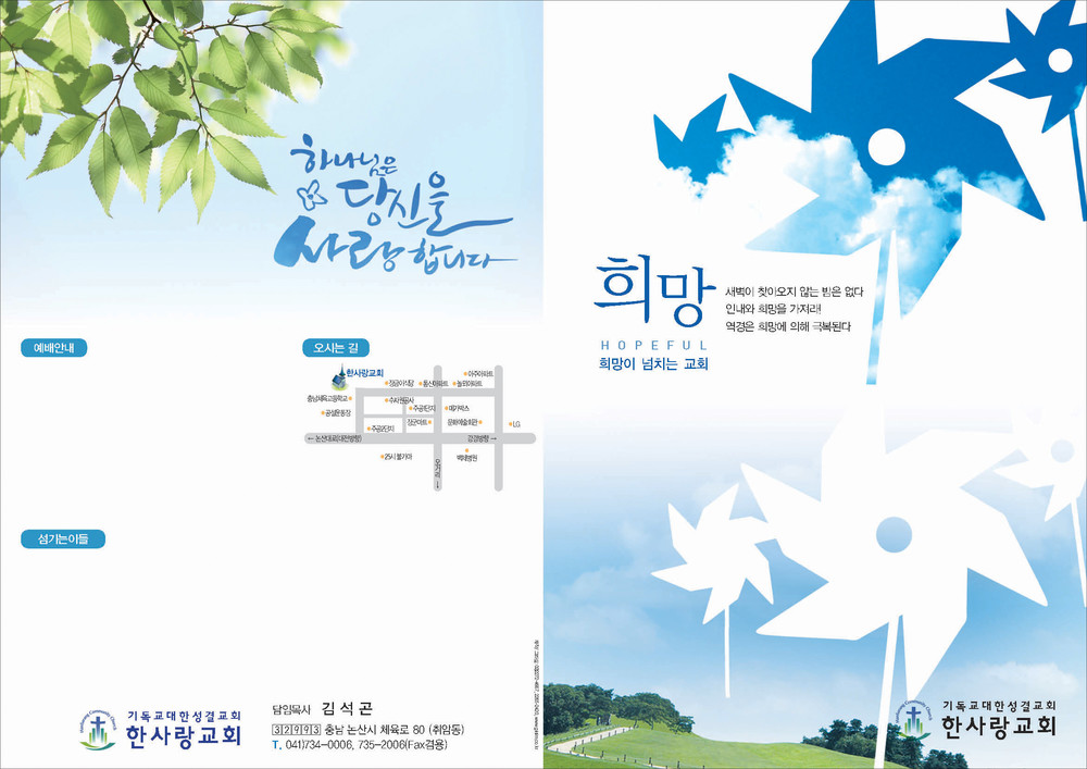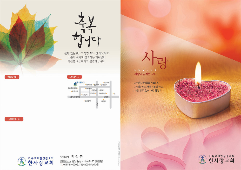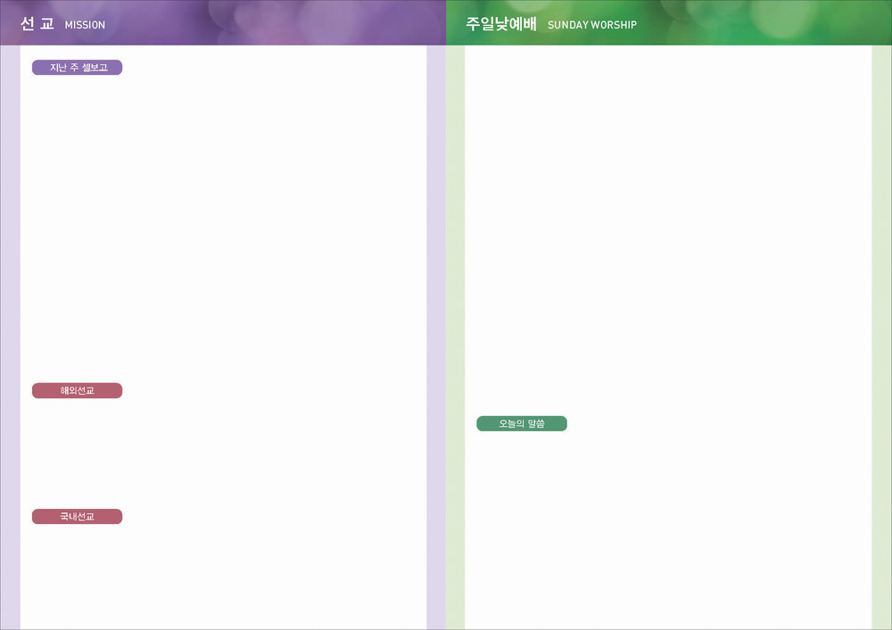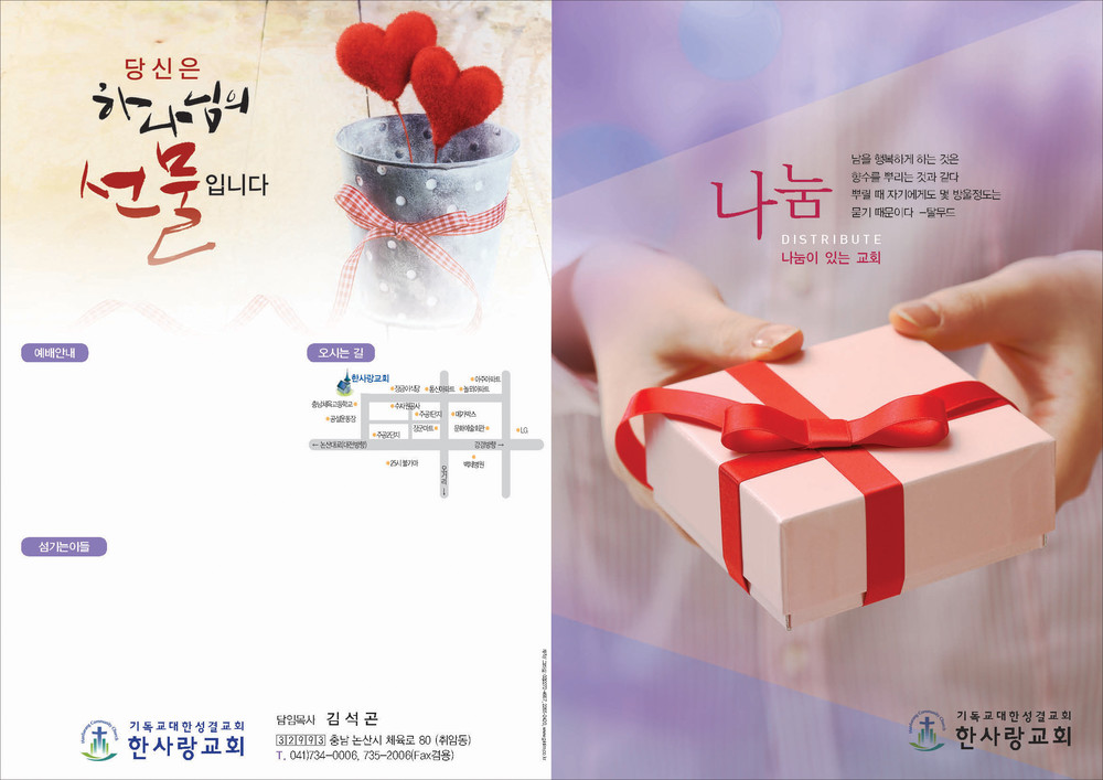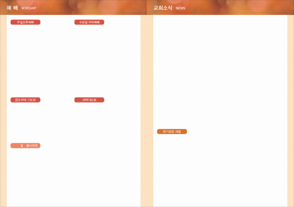 모든 디자인이 완료된 후 현재 교회가 사용중인 한글파일을 보내주시면, 새로운 주보에 맞추어 인쇄가 가능하도록 한글파일을 제작해드리고 있습니다. (한글작업 요청시 약 1-3일 정도의 시간이 소요되오니 참고해 주시기 바랍니다.)