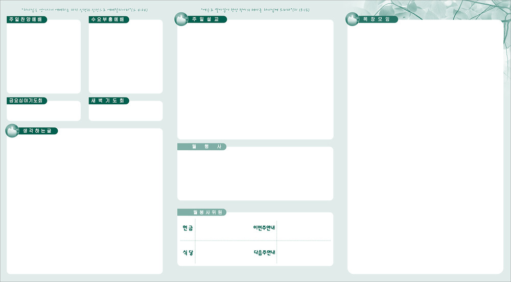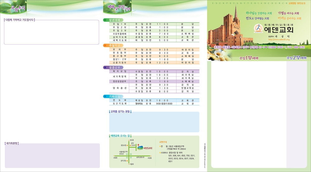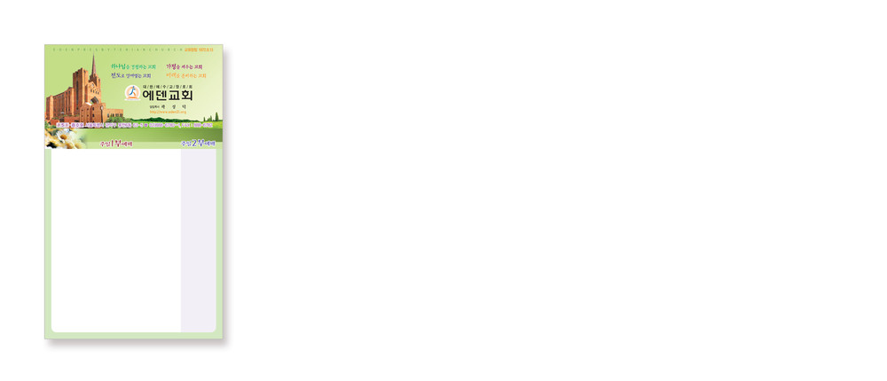 모든 디자인이 완료된 후 현재 교회가 사용중인 한글파일을 보내주시면, 새로운 주보에 맞추어 인쇄가 가능하도록 한글파일을 제작해드리고 있습니다. (한글작업 요청시 약 1-3일 정도의 시간이 소요되오니 참고해 주시기 바랍니다.)
