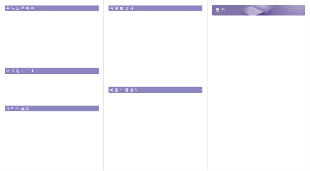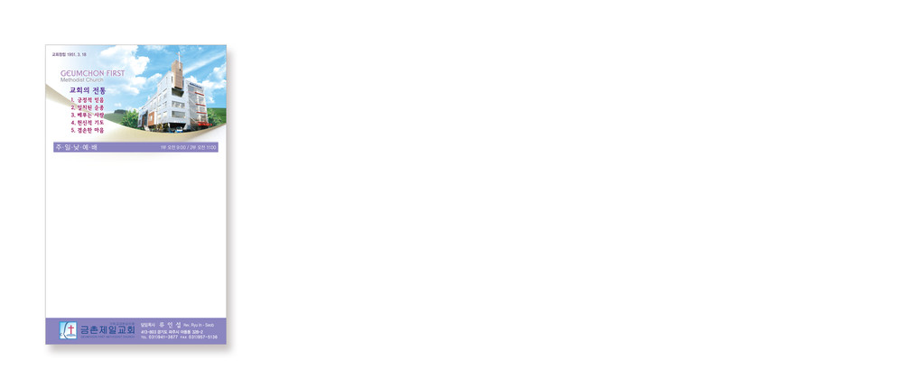 모든 디자인이 완료된 후 현재 교회가 사용중인 한글파일을 보내주시면, 새로운 주보에 맞추어 인쇄가 가능하도록 한글파일을 제작해드리고 있습니다. (한글작업 요청시 약 1-3일 정도의 시간이 소요되오니 참고해 주시기 바랍니다.)