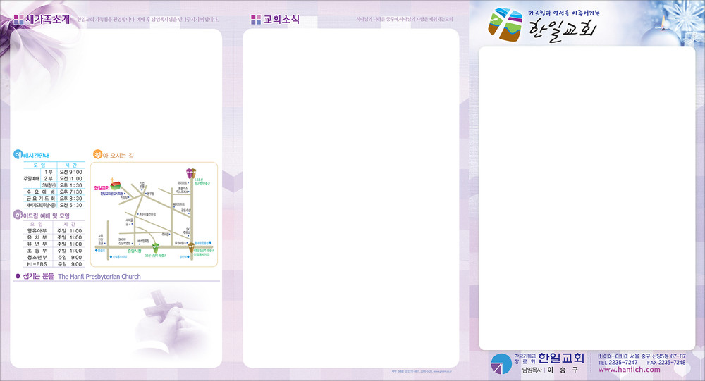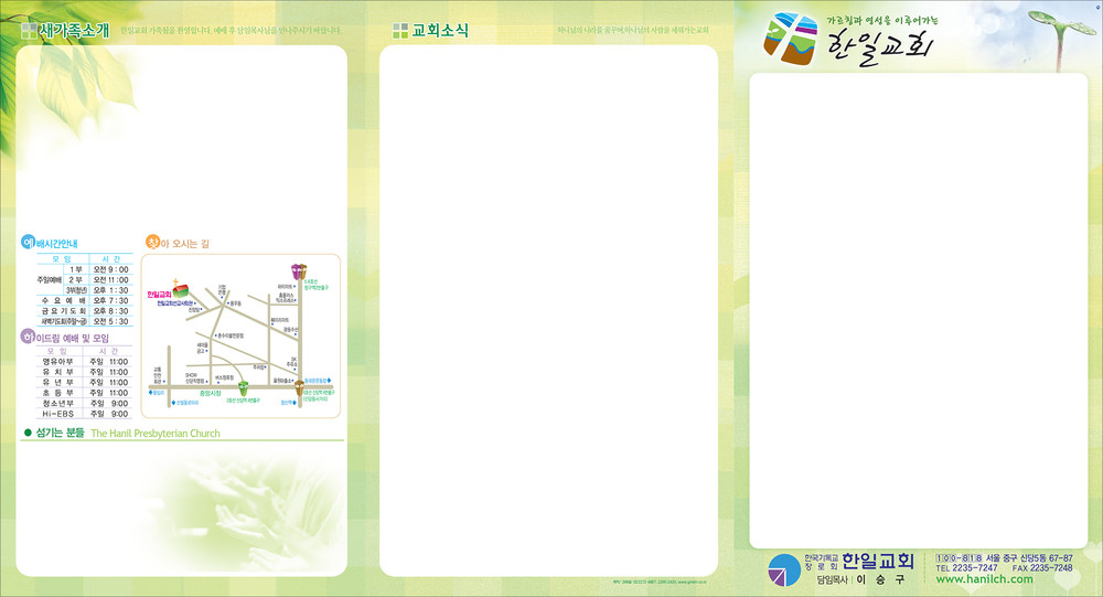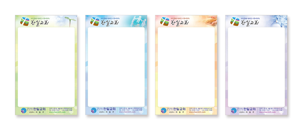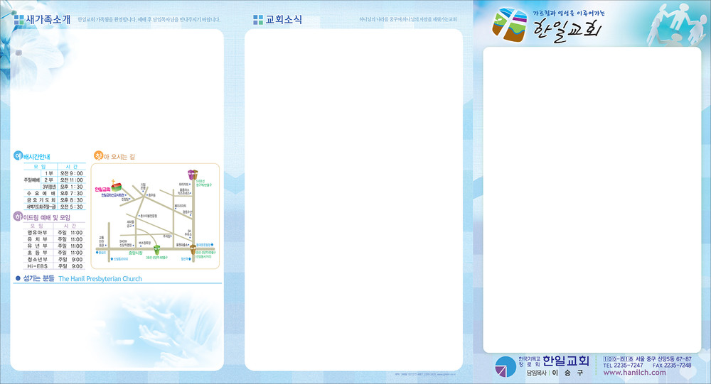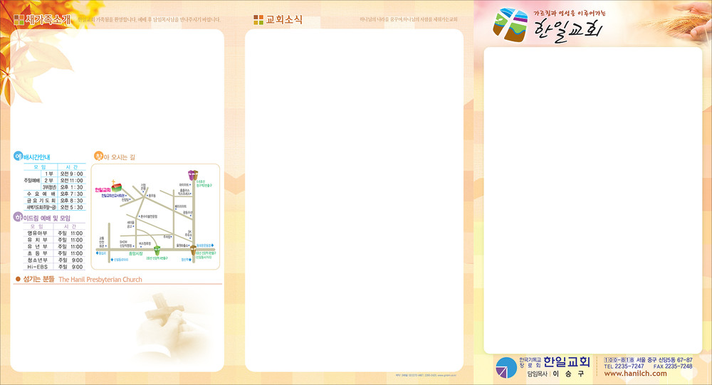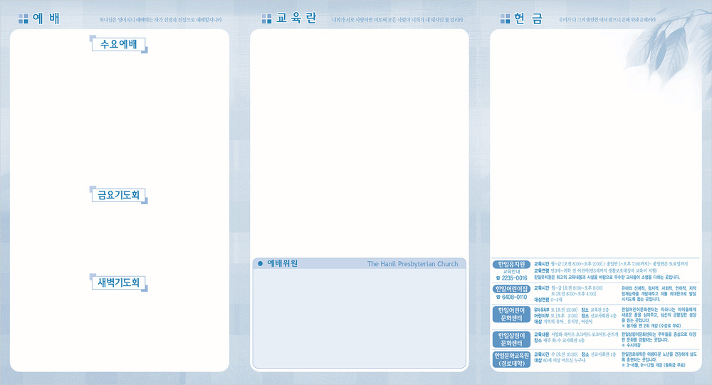 모든 디자인이 완료된 후 현재 교회가 사용중인 한글파일을 보내주시면, 새로운 주보에 맞추어 인쇄가 가능하도록 한글파일을 제작해드리고 있습니다. (한글작업 요청시 약 1-3일 정도의 시간이 소요되오니 참고해 주시기 바랍니다.)