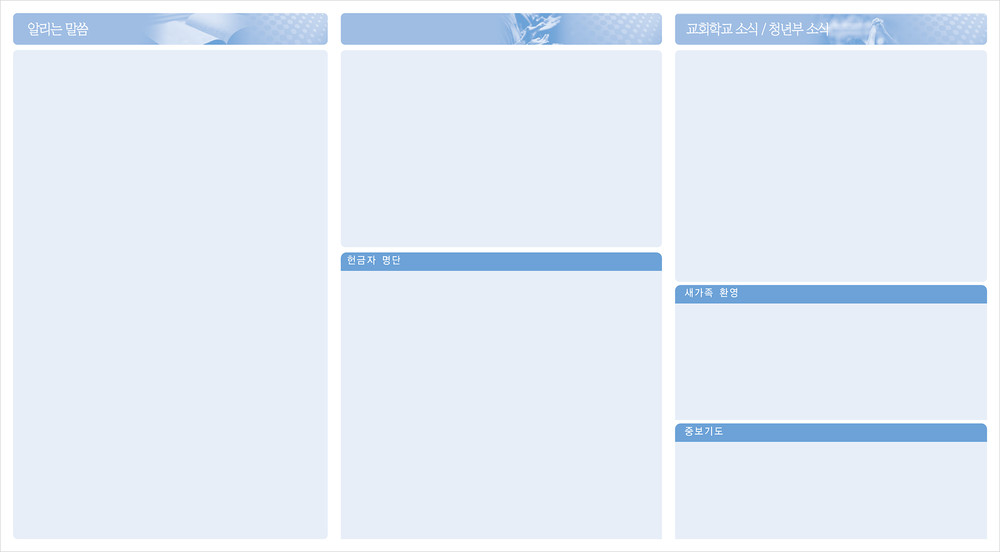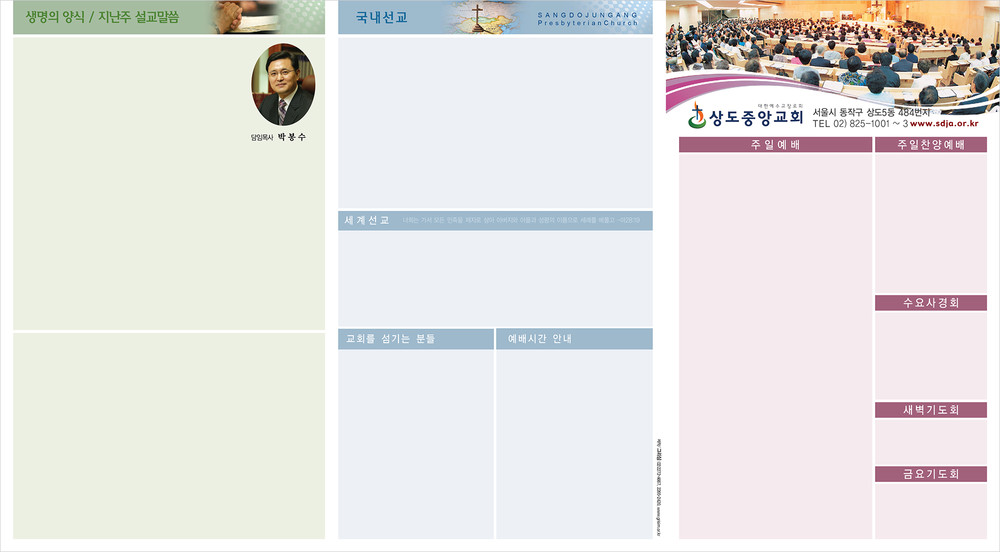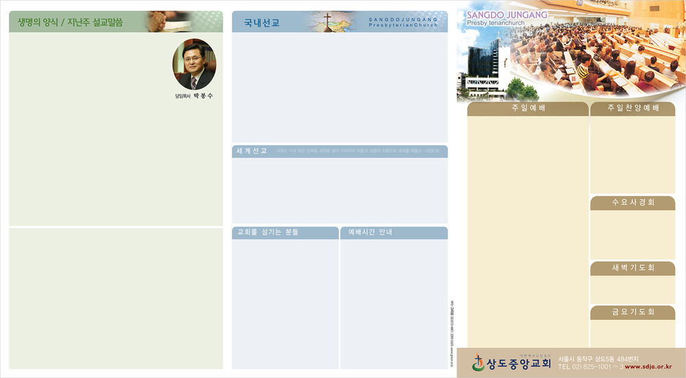 모든 디자인이 완료된 후 현재 교회가 사용중인 한글파일을 보내주시면, 새로운 주보에 맞추어 인쇄가 가능하도록 한글파일을 제작해드리고 있습니다. (한글작업 요청시 약 1-3일 정도의 시간이 소요되오니 참고해 주시기 바랍니다.)