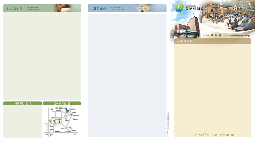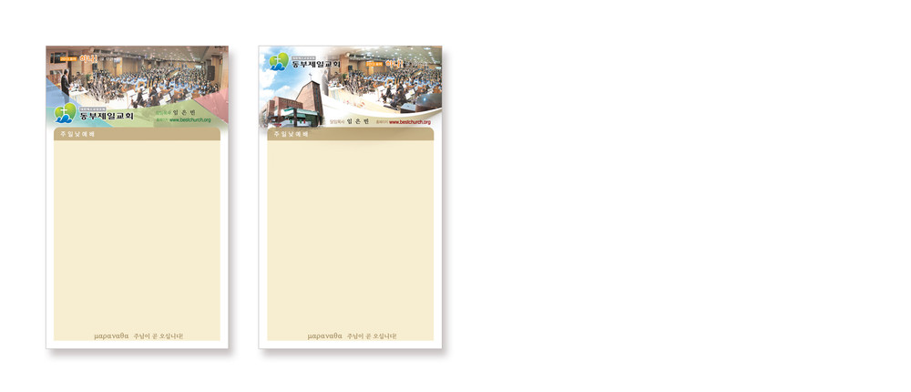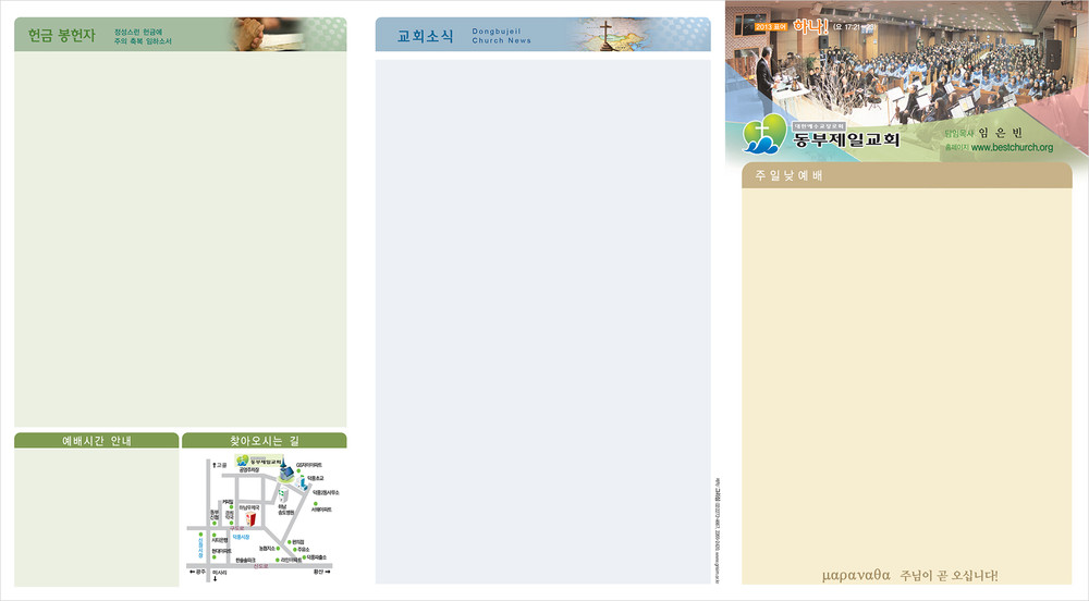 모든 디자인이 완료된 후 현재 교회가 사용중인 한글파일을 보내주시면, 새로운 주보에 맞추어 인쇄가 가능하도록 한글파일을 제작해드리고 있습니다. (한글작업 요청시 약 1-3일 정도의 시간이 소요되오니 참고해 주시기 바랍니다.)
