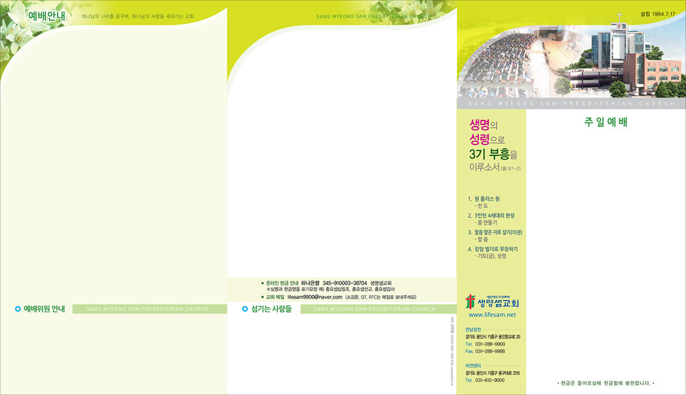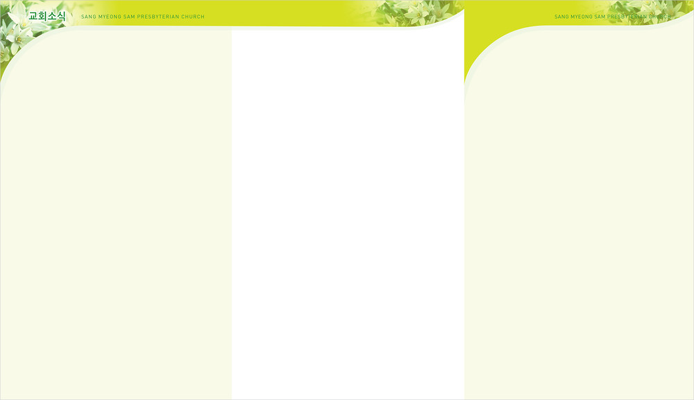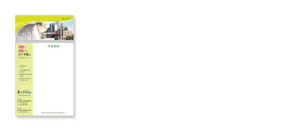 모든 디자인이 완료된 후 현재 교회가 사용중인 한글파일을 보내주시면, 새로운 주보에 맞추어 인쇄가 가능하도록 한글파일을 제작해드리고 있습니다. (한글작업 요청시 약 1-3일 정도의 시간이 소요되오니 참고해 주시기 바랍니다.)